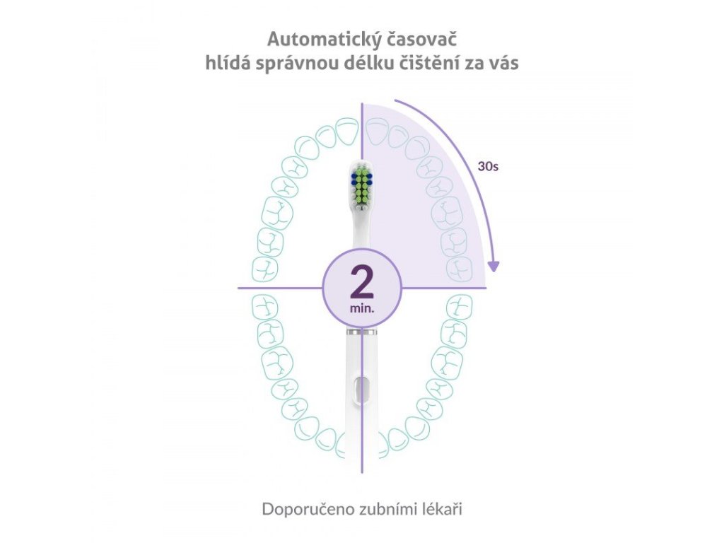 Kartáček je vybaven časovačem nastaveným na ideální 2 minuty čištění, poté se automaticky vypne.