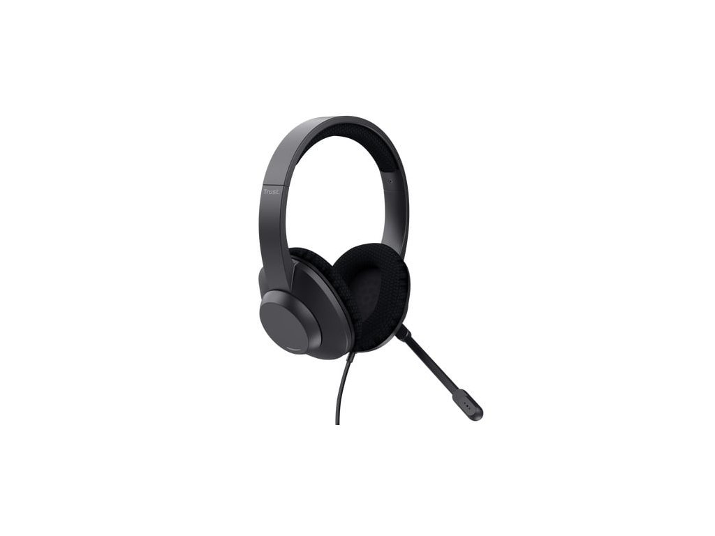 Pohodlná USB sluchátka přes uši s mikrofonem s potlačením hluku a polstrovaným hlavovým mostem.