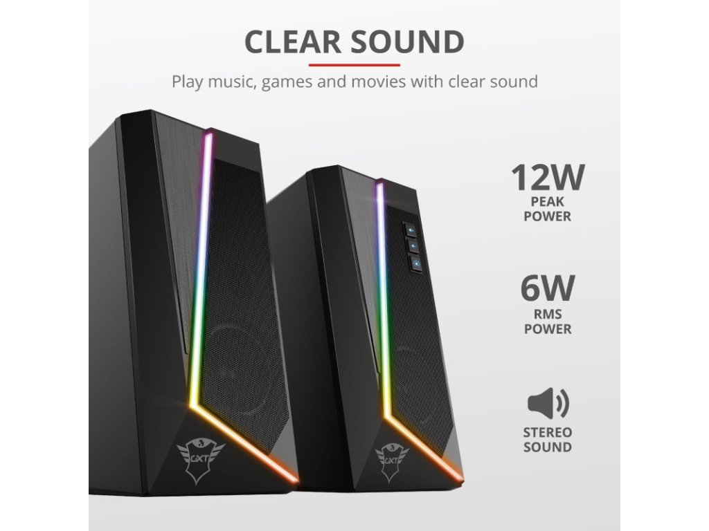Trust GXT 609 Zoxa RGB Illuminated Speaker Set. Stylová sada stereofonních reproduktorů s osvětlením RGB a snadno dostupnými ovládacími prvky. S elegantním designem a jemným RGB osvětlením je Trust GXT 609 Zoxa stylovým doplňkem každého stolu. Kromě toho se tato sada stereofonních reproduktorů snadno používá a nepotřebuje ani zásuvku. Zapnou se automaticky při zapnutí počítače.