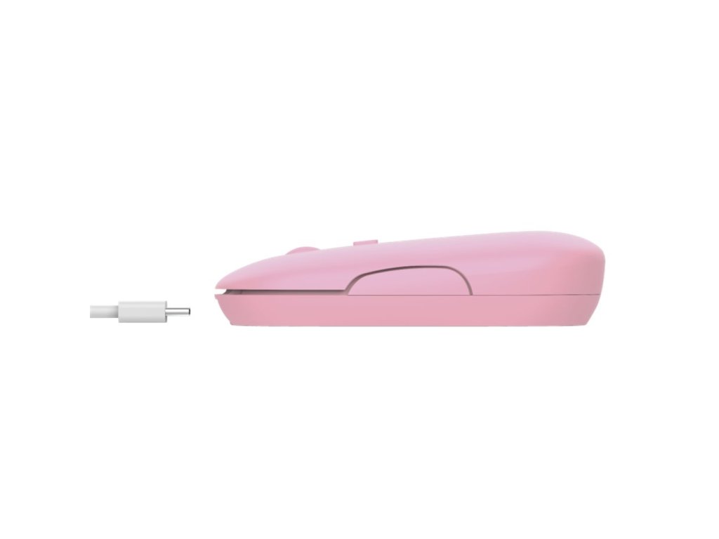 myš optická bezdrátová, dobíjecí konektor USB-C, Bluetooth nebo RF 2.4GHz, mikro přijímač USB, dosah až 10m, 800-1600dpi, 4 tlačítka, souměrný design, tichá, nabíjecí kabel, barva růžová
