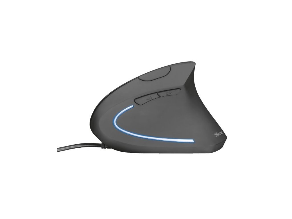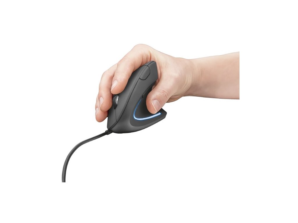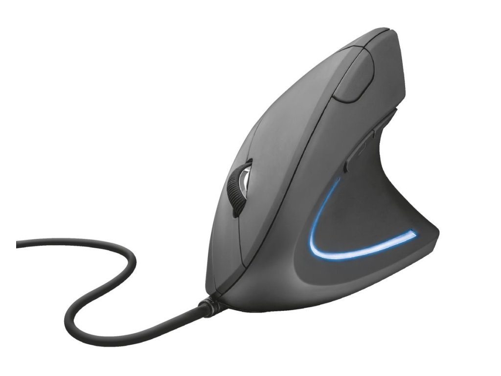 optická myš, vertikální design, drátová USB, až 1600dpi, 6 tlačítek, černá, pro pravoruké uživatele, 150cm kabel, modré LED osvětlení, díky ergonomickému vertikálnímu provedení se snižuje míra námahy na rameno a zápěstí