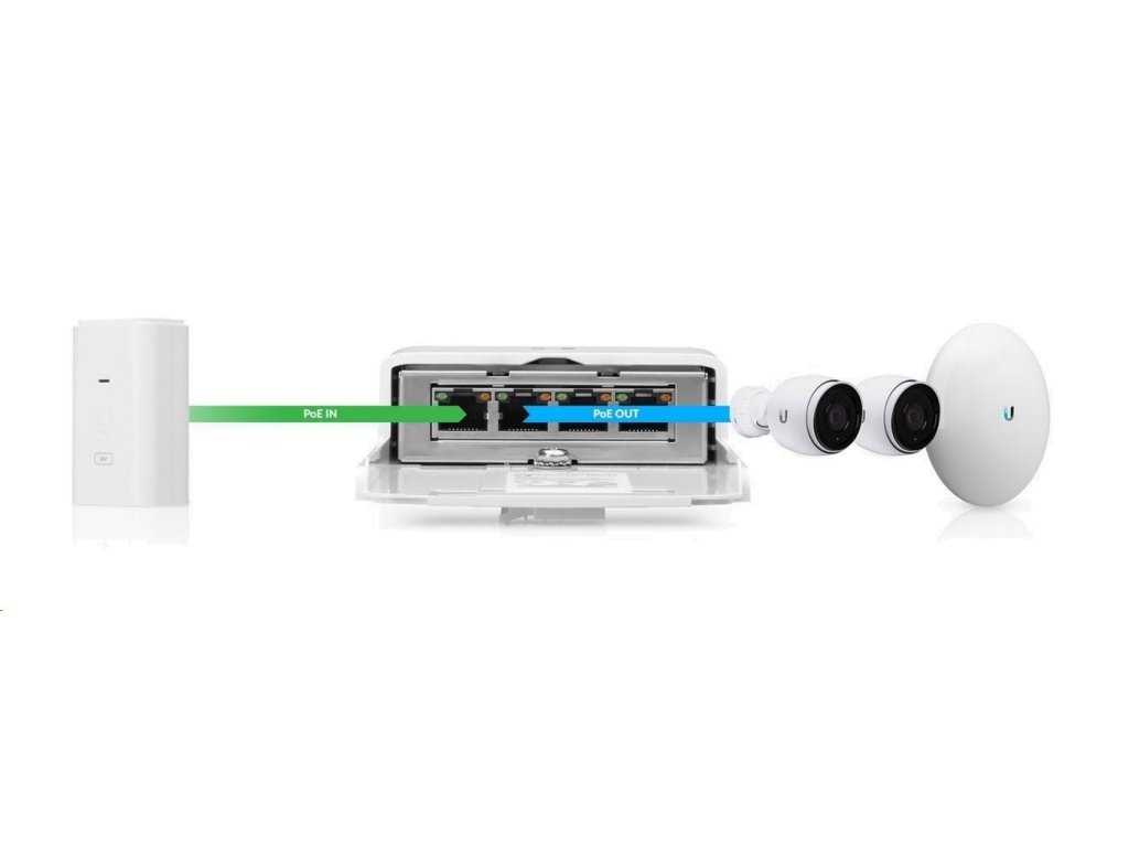 Zbylé 3 porty slouží pro napájení dalších zařízení s podporou 24V pasivního Gigabit PoE s podporou napájení po 2 párech (standard pro zařízení typu NanoStation, PowerBeam, AirGrid atd.). Maximální spotřeba na port je 24W, celková spotřeba všech 3 PoE portů je max. 24W.