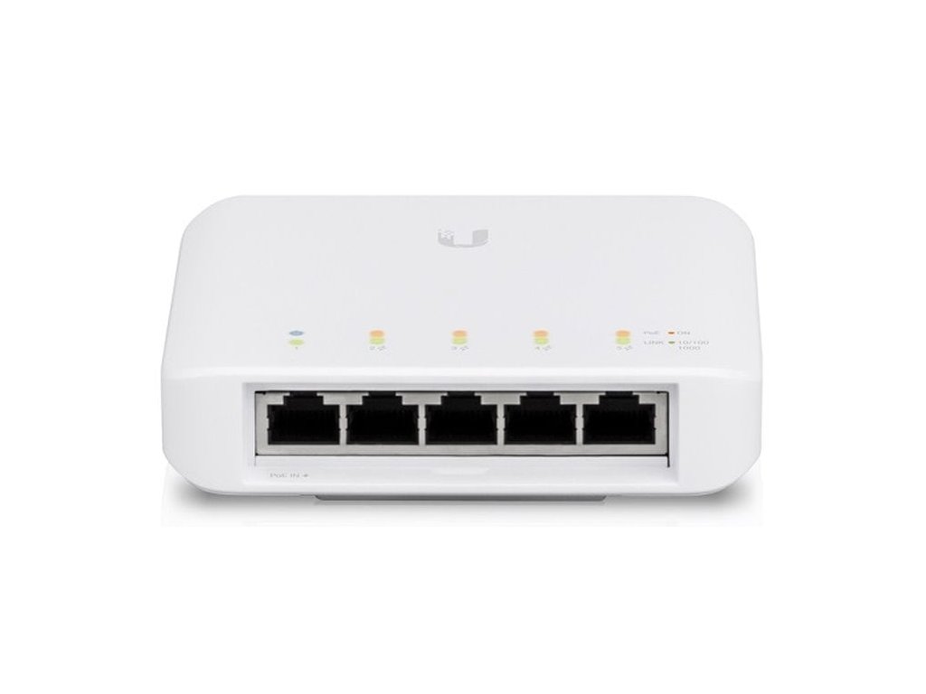 USW-FLEX je 5-portový venkovní Gigabitový switch s možností PoE-In a PoE-Out na 4 portech. Switch umožňuje na výstupních portech aktivní napájení typu 802.3af, což dává celkově 15.4W na každém portu.