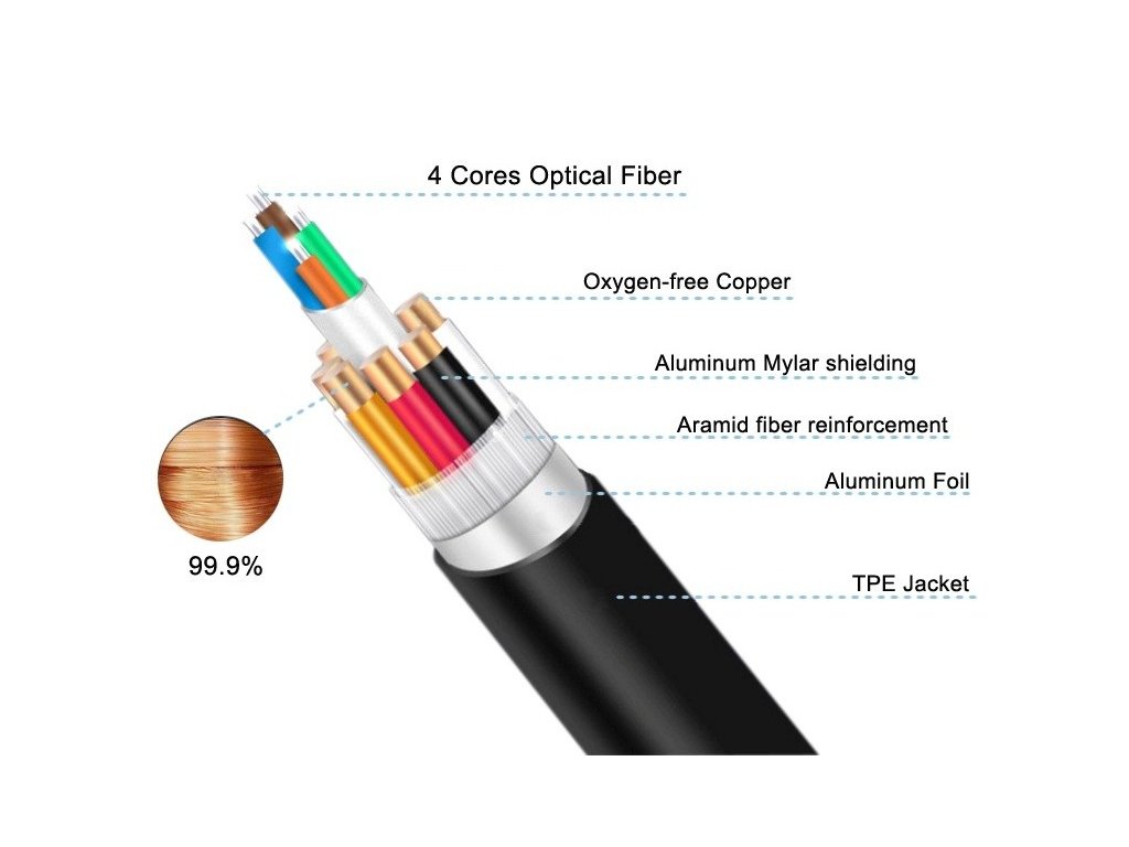 - Optický AOC kabel se vyznačuje vynikajícím přenosem signálu na velké vzdálenosti beze ztrát, je odolný proti elektromagnetickému rušení a dává nejlepší možný obraz ve srovnání s metalickými kabely.