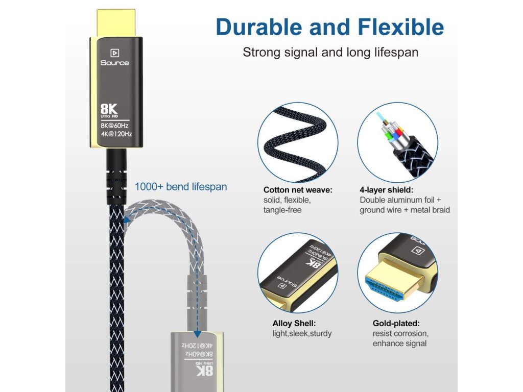 - HDMI 2.1 Ultra High Speed aktivní optický fiber kabel, podporuje HDMI2.1 nebo nižší HDMI2.0 a HDMI1.4