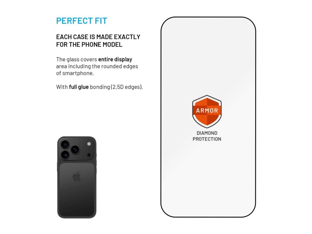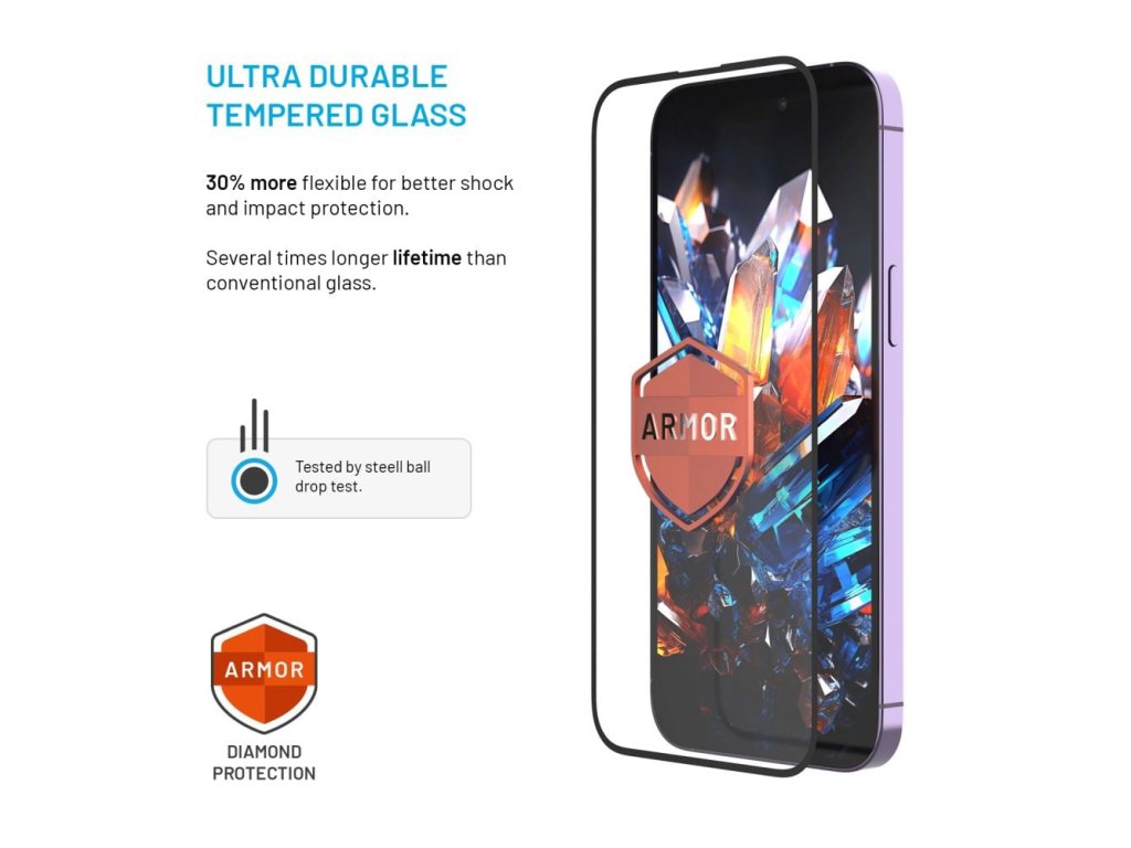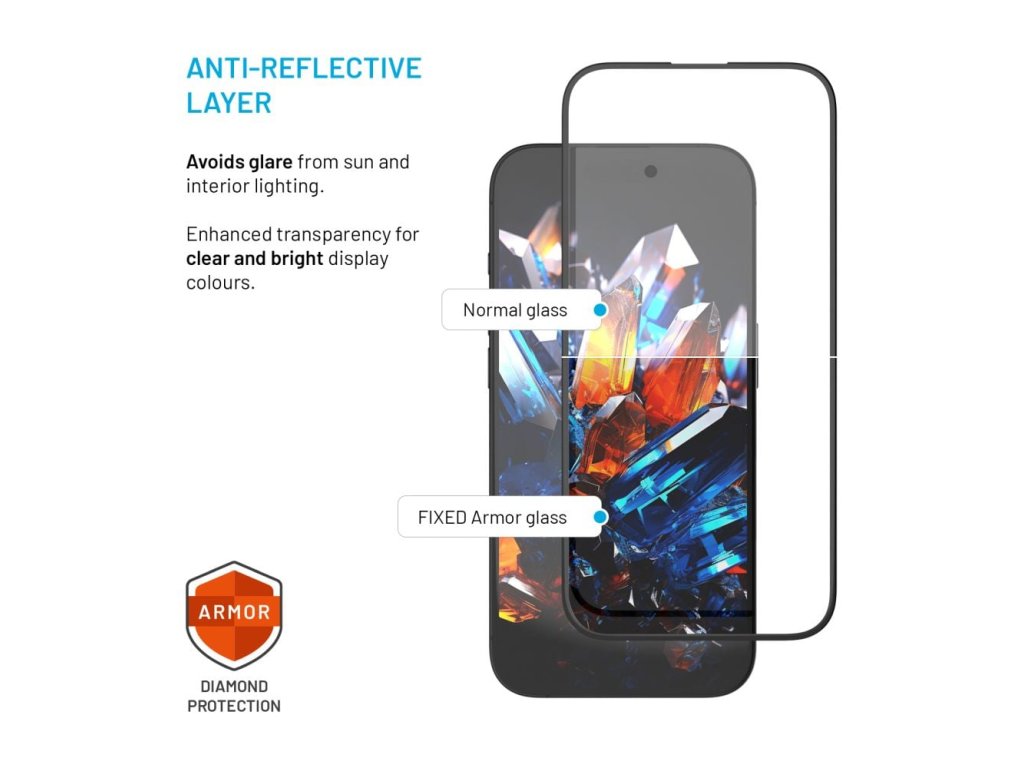 Ultra odolné tvrzené sklo Armor představuje dokonalou neviditelnou ochranu displeje, která zaručuje mnohonásobně delší životnost a odolnost proti nárazům. Sklo je vyrobeno z vysoce kvalitních materiálů, což mu poskytuje vyšší tvrdost ve srovnání s běžnými ochrannými skly. Díky zvýšené pružnosti účinně pohlcuje nárazy a odolává téměř jakémukoliv pádu, poškrábání a minimalizuje riziko prasknutí. Speciální antireflexní úprava zlepšuje čitelnost displeje, eliminuje odlesky slunce a umělého světla, zatímco vylepšená oleofobní vrstva zajišťuje hladký pohyb prstů po displeji bez zanechávání otisků. Jeho přesnou aplikaci zvládne každý díky aplikátoru s unikátní anti-dust fólií, která odstraňuje prach či jiné nečistoty a zabraňuje vzniku vzduchových bublin. Extrémní odolnost a další vlastnosti skla Armor jsou důkladně testovány společností FIXED.