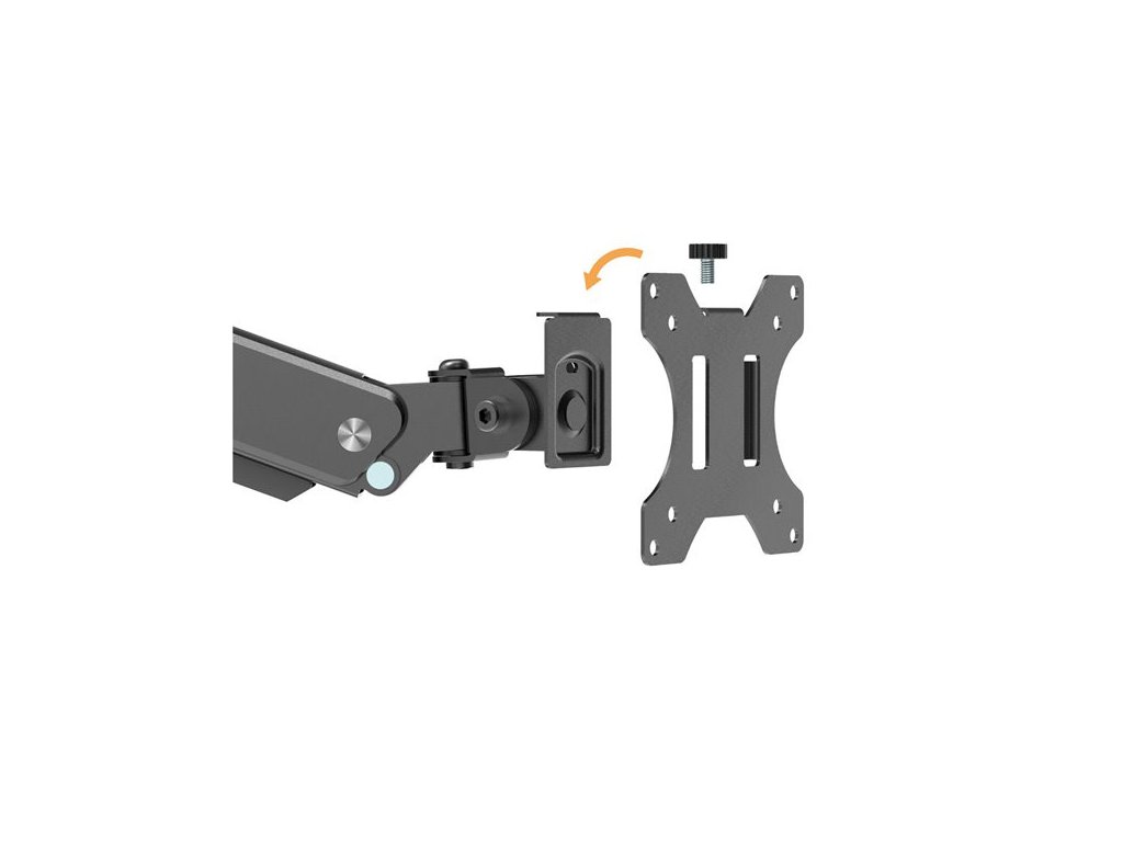 Rotační pohyb držáku lze blokovat v rozsahu 180 stupňů, což umožňuje jeho vyztužení v libovolné poloze po celé ploše pracovní plochy. Zámek je zvláště užitečný, pokud plánujete rozmístit více monitorů na jednotlivé držáky. V tomto případě umožňuje zachovat přesné uspořádání displejů vůči sobě a zaručuje tak stabilní pracovní plochu na více monitorech.