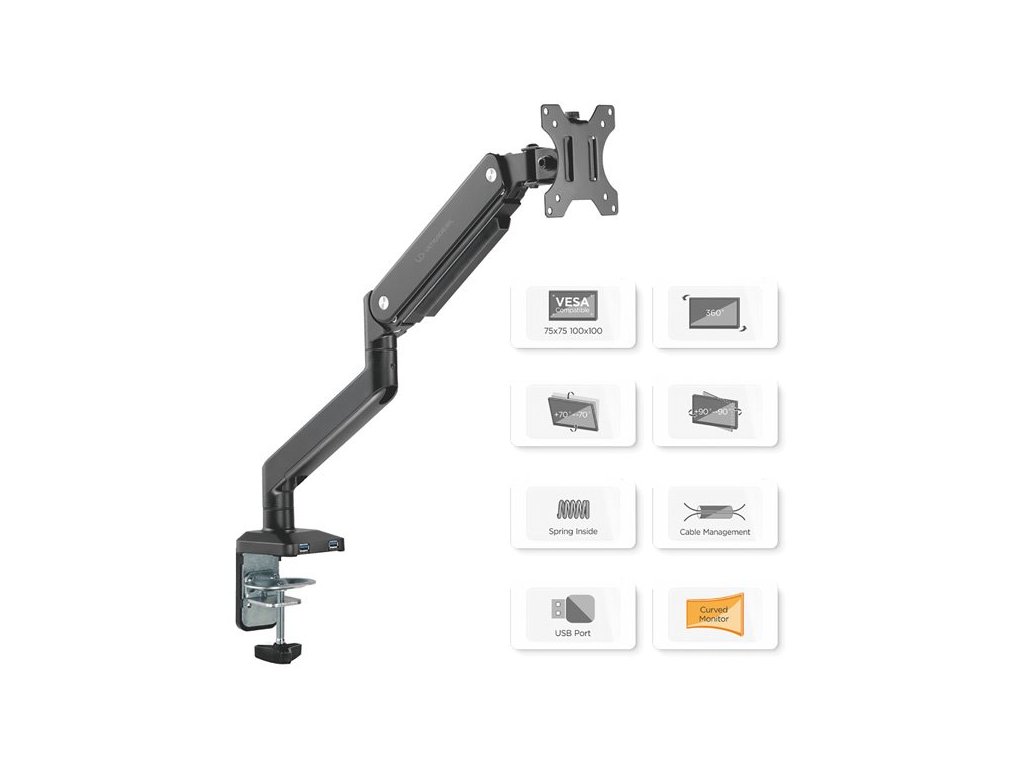 Polohovatelný držák pro monitor, montáž VESA (75x75 mm/100x100 mm), nosnost 10 KG, pro monitor až 32”, černý