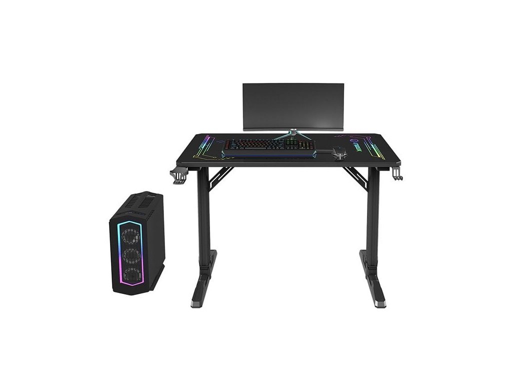 Herní stůl, rozměry 109x69 cm, výška 75 cm, povrch z tvrzeného skla ULTRA-GLASS, RGB podsvícení, síťka, držák na sluchátka a nápoje, černý