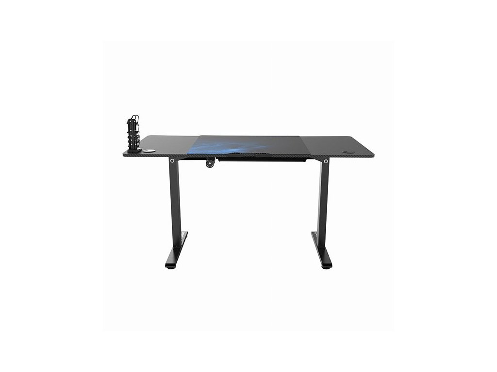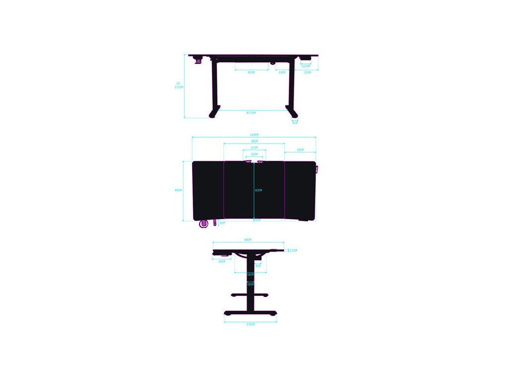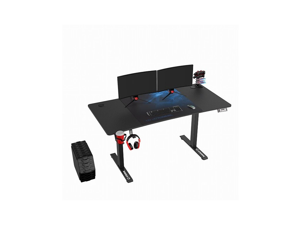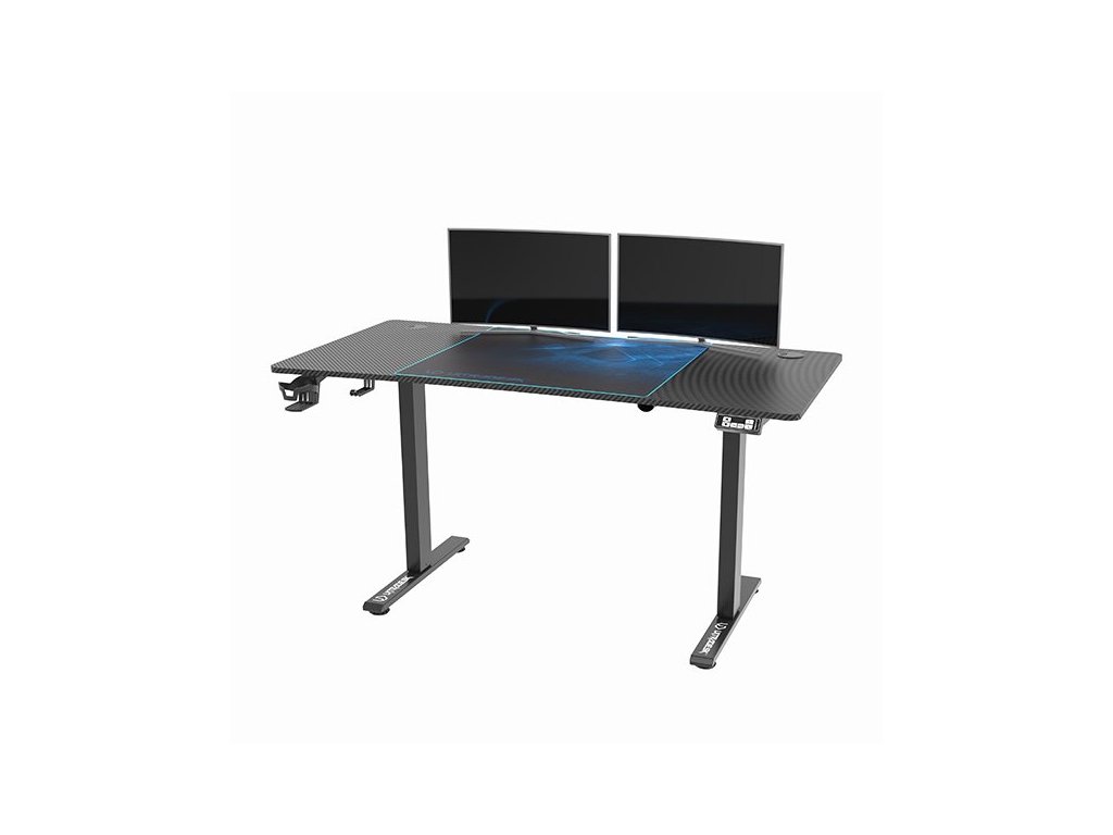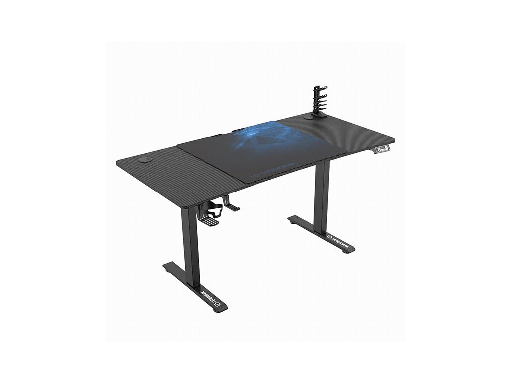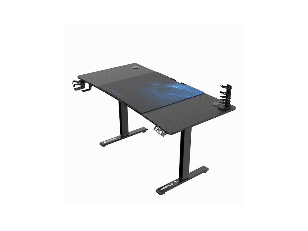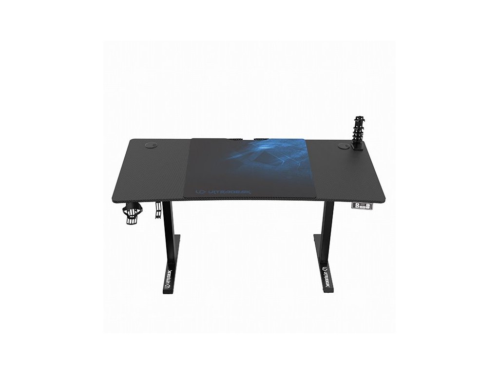 Herní stůl, rozměry 140x68 cm, elektricky nastavitelná výška 72-117 cm, XXL podložka pod myš, se stojanem Ultradesk Beam, držák sluchátek i nápojů, modrý