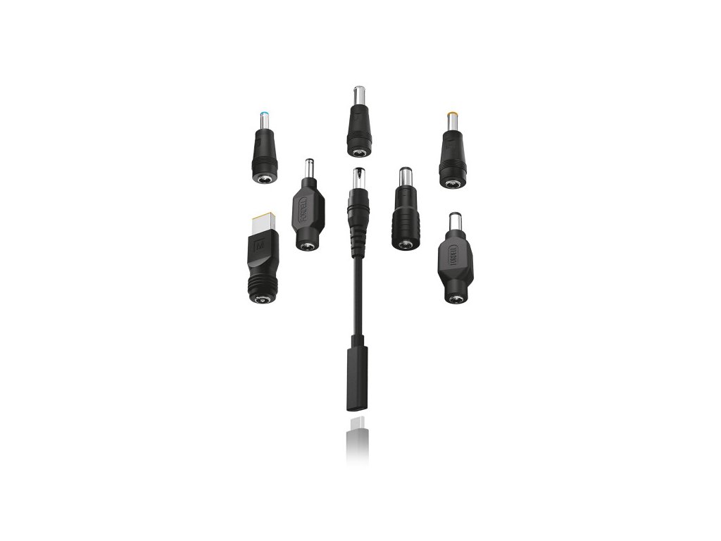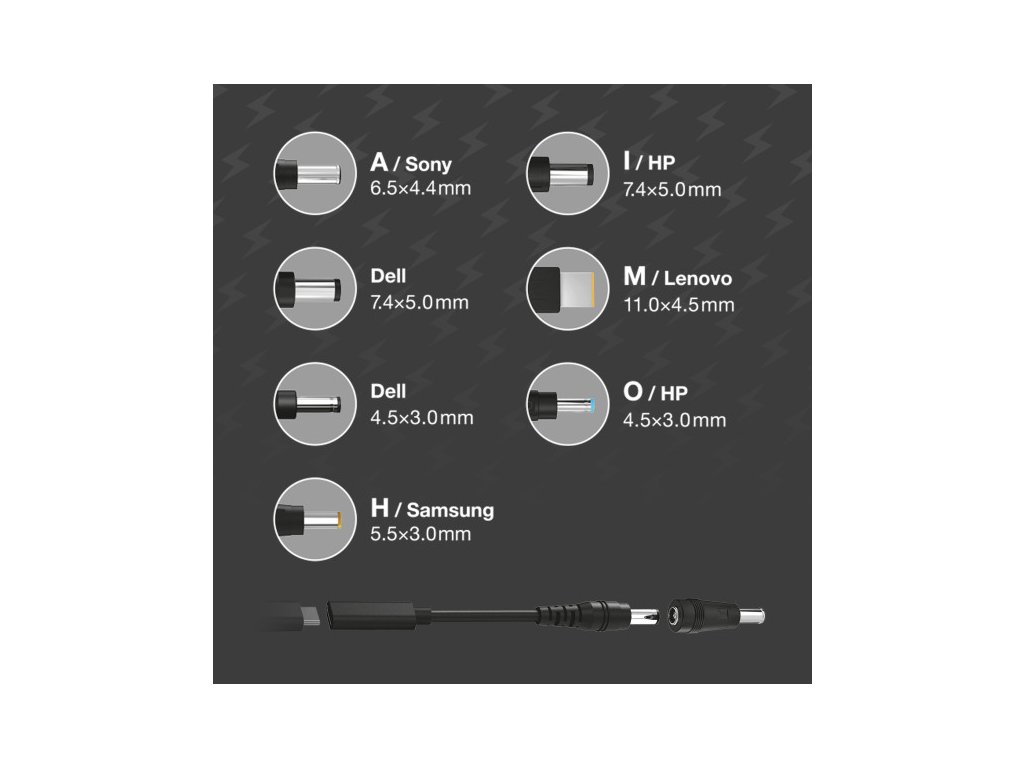 Tento adaptér je ideálním pomocníkem pro dobíjení velké části notebooků a ultrabooků. Pečlivě jsme si dali záležet při výběru typů konektorů. Vyberte si jeden ze 7 přiložených konektorů (koncovek), který bude vhodný pro nabíjení Vašeho zařízení.