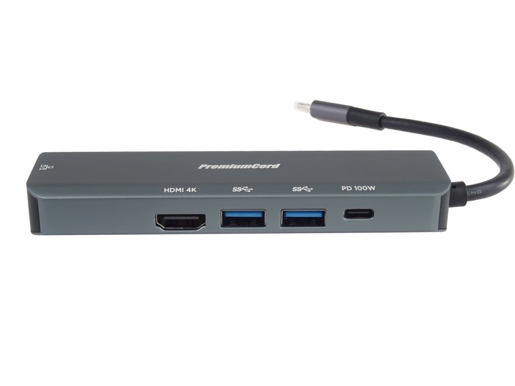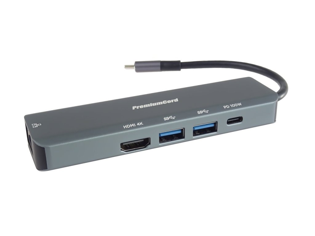 PremiumCord USB-C na HDMI + 2x USB3.2 + PD 100W+ RJ45 10/100/1000Mbps adaptér