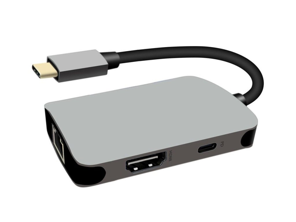 USB-C na HDMI + RJ45 + PD adaptér, hliníkové pouzdro