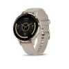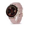 Elegantní, chytré GPS hodinky se zářivým 1,2" Amoled displejem, nerezovou lunetou v barvě Soft Gold, usazené v pouzdře barvy French Gray o průměru 41 mm s příjemným silikonovým řemínkem a s možností Bluetooth volání ze zápěstí.