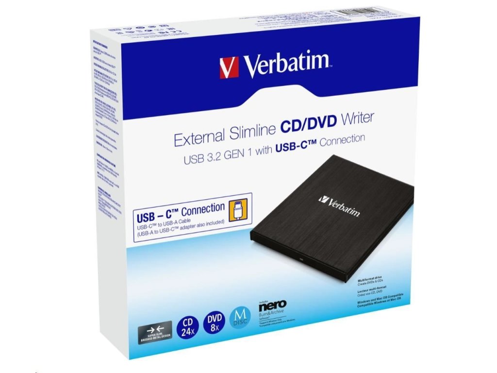 Verbatim Slimline CD/DVD Writer, externí vypalovačka, USB-C