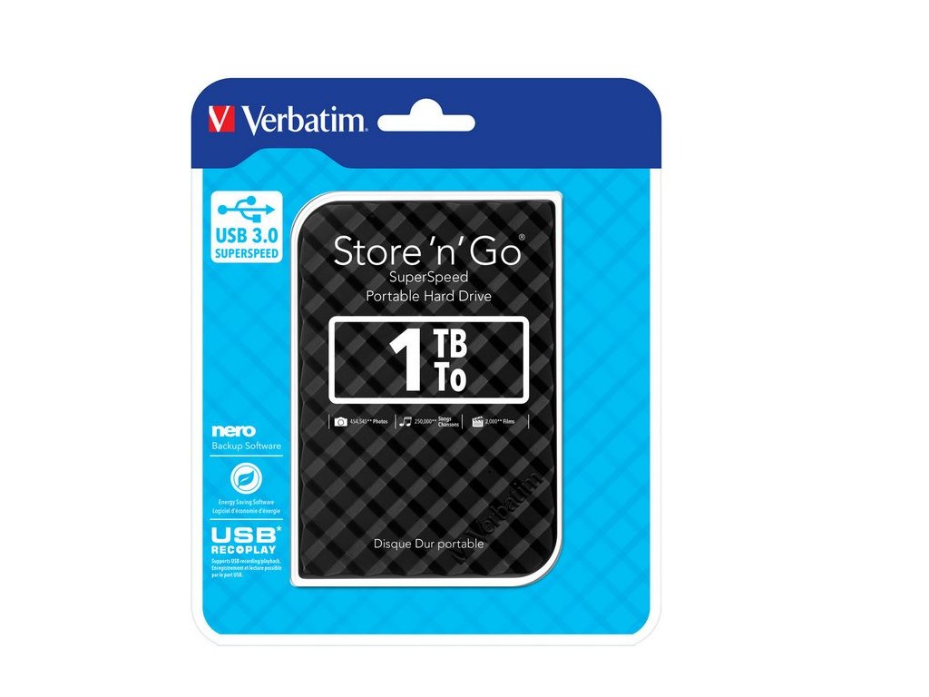 Přenosný pevný disk Verbatim Store n Go nabízí velkokapacitní úložiště s rozhraním USB 3.0 Super Speed. Rozhraní USB 3.0 nabízí až desetkrát rychlejší přenos dat než USB 2.0 (podle rychlosti sběrnice USB), takže umožňuje extrémně rychlý přenos dat na cestách.