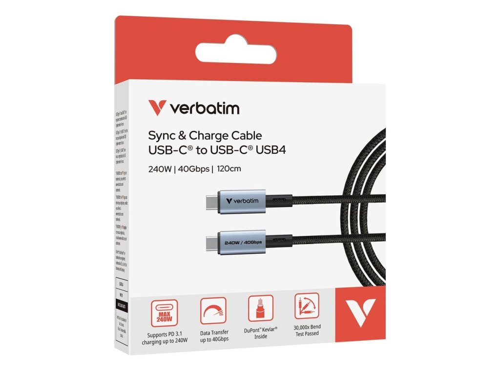 Kabel Verbatim Sync & amp; Charge USB-C® na USB-C USB4 je navržen pro vysoce výkonná zařízení a poskytuje mimořádně rychlé nabíjení a přenos dat. Ať už pracujete s náročnými aplikacemi nebo přenášíte velké soubory, tento kabel nabízí bezkonkurenční rychlost a výkon, takže je ideální pro nejnovější zařízení USB-C.