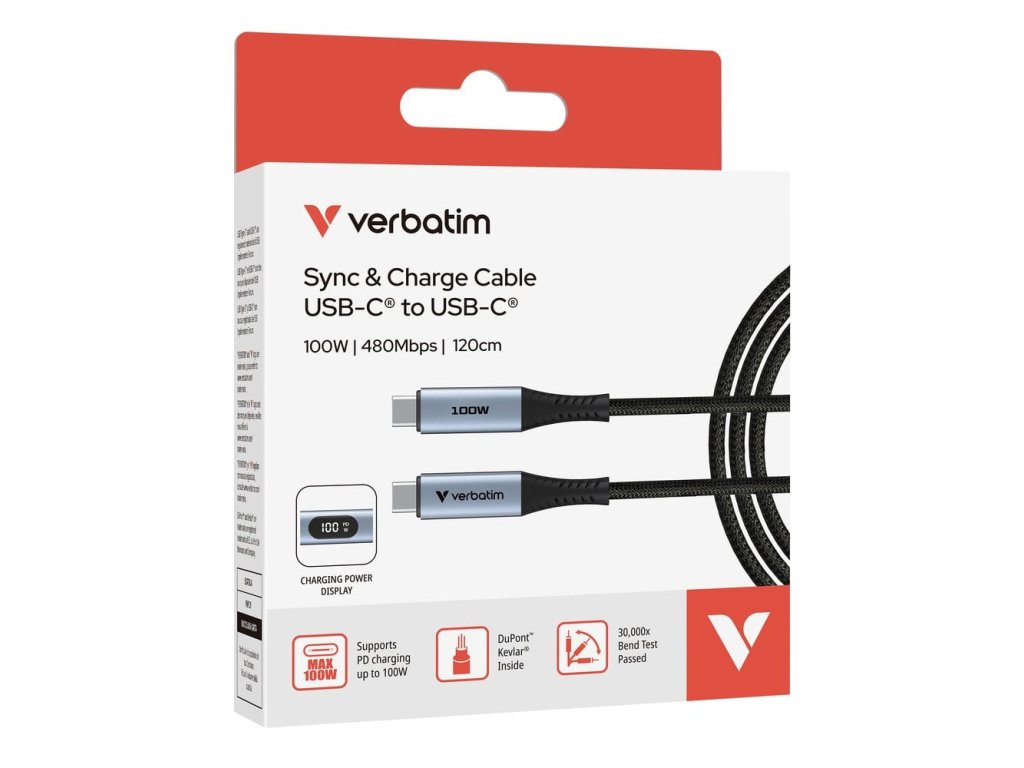 Kabel Verbatim Sync & Charge USB-C® na USB-C® se zobrazením napájení (100 W, 120 cm)
