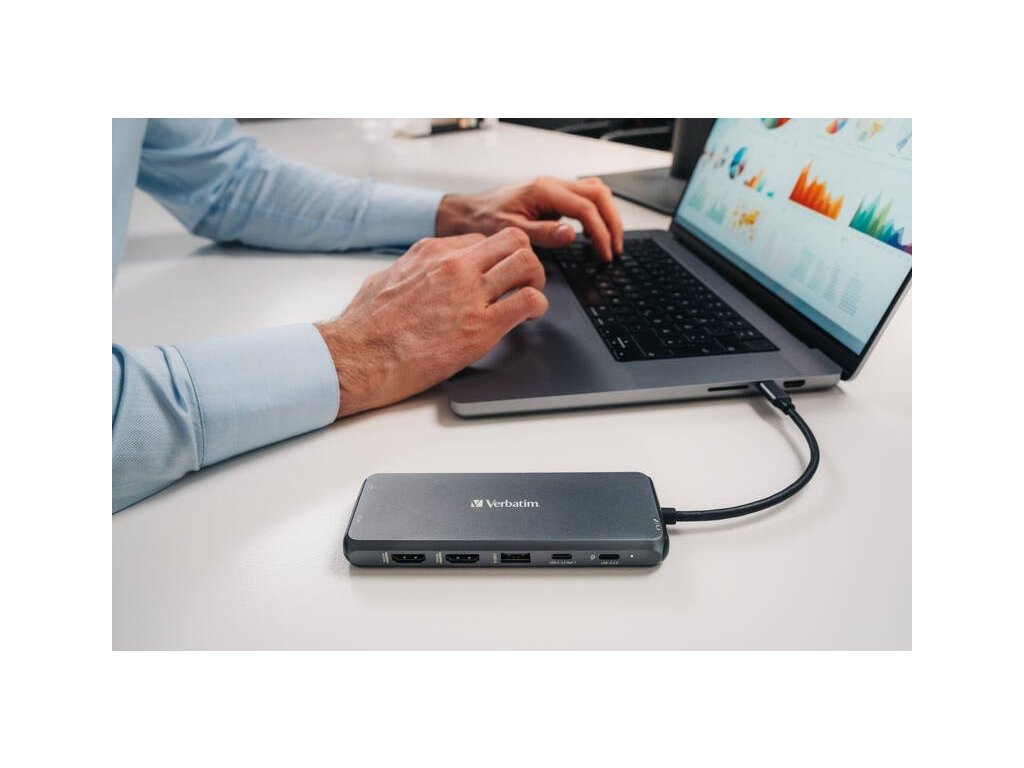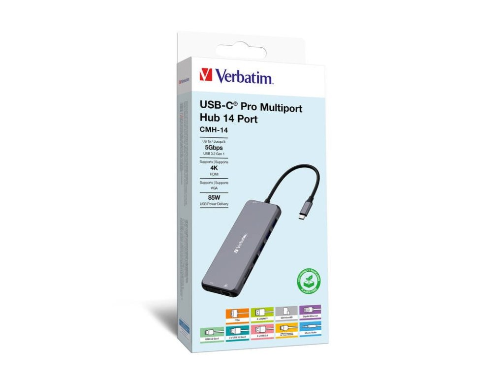 Víceportový rozbočovač Verbatim USB-C® Pro 14-Port Multiport Hub je vybaven širokým spektrem možností připojení. Jeho čtrnáct portů, mezi kterými nechybí ani duální HDMI porty a VGA port pro podporu starších monitorů, poskytuje možnost práce a prohlížení na více obrazovkách. Velké množství USB portů (včetně pěti USB-A a dvou USB-C, kdy jeden z nich je USB-C PD) nabízí možnosti pro vícero zařízení a výhodu pevného internetového připojení prostřednictvím gigabitového ethernetového portu. Začínající fotografové u něj ocení, že jim nabídne slot na paměťové karty SD a microSD. Usnadní a urychlí jim totiž přenos fotografií a videí. A nakonec je tu zvukový port s 3,5mm konektorem, s nímž je použití reproduktorů nebo náhlavní soupravy snadné a praktické.