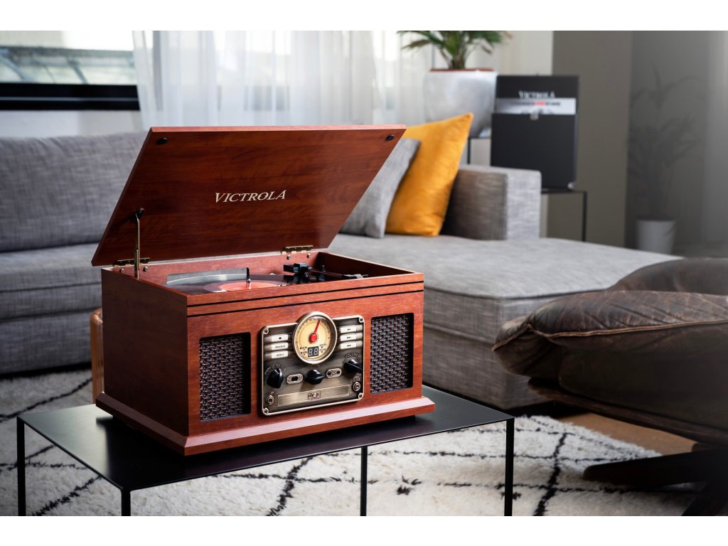 Victrola VTA-200B, all-in-one zařízení, FM rádio (analog), CD a kazetová mechanika, gramofon, 3 rychlosti 33 1/3, 45, a 78 RPM, Bluetooth, Aux-in, RCA výstup, zabudované reproduktory