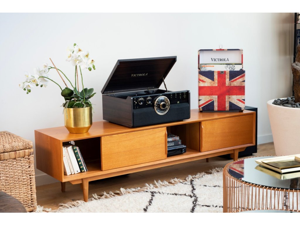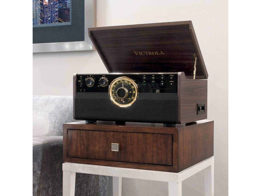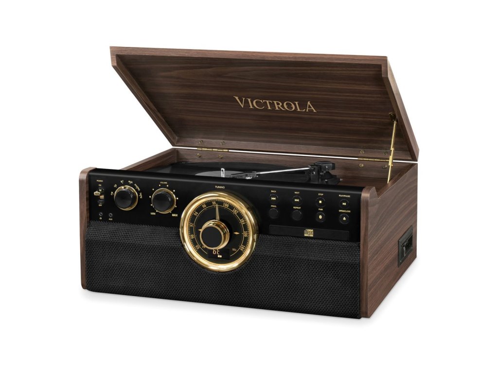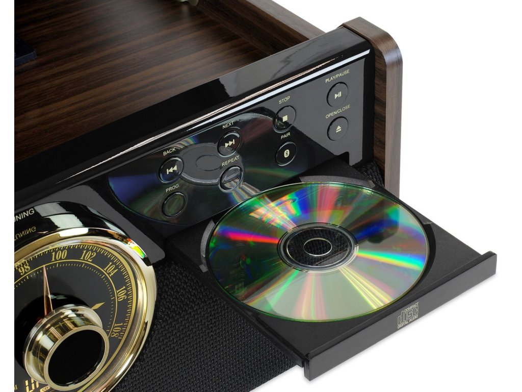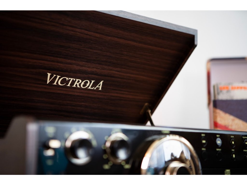 Victrola VTA-270B, retro gramofon, 3 rychlosti 33 1/3, 45, a 78 RPM, FM tuner (analog), CD a kazetová mechanika, Bluetooth, Aux-in, RCA výstup a výstup na sluchátka, zabudované reproduktory