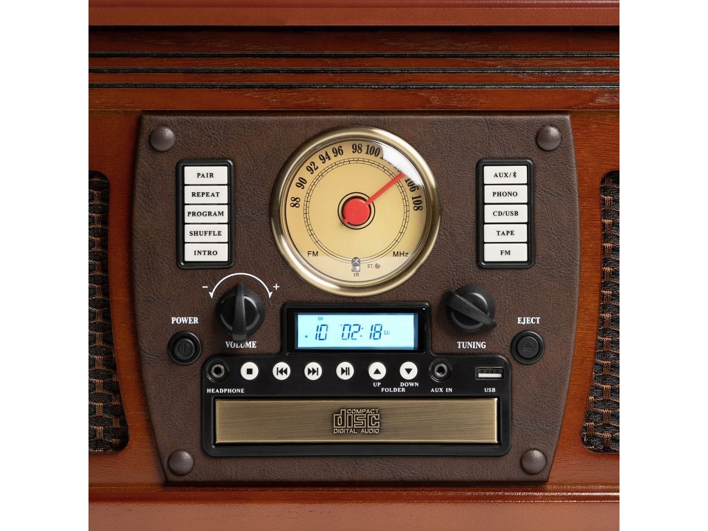 Řemínkový gramofon 8v1, 3-rychlostní, technologie Vinyl Stream (Bluetooth OUT), Bluetooth, AUX, CD, kazeta, rádio, USB flash disk, výstup RCA a na sluchátka