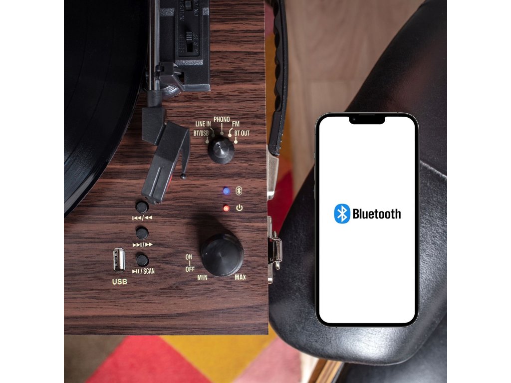 Řemínkový gramofon, 3-rychlostní, technologie Vinyl Stream, Bluetooth, USB, AUX, výstup RCA, FM rádio