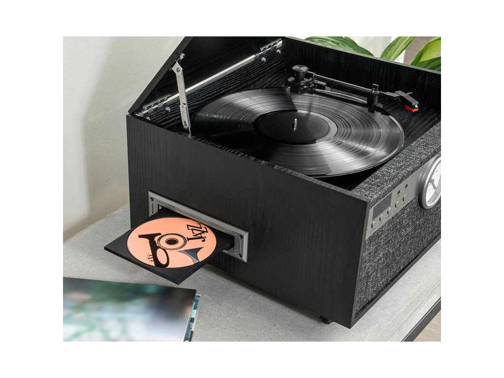Řemínkový gramofon, 3-rychlostní, technologie Vinyl Stream, vstupy: Bluetooth, AUX, CD, kazeta, RCA výstup a výstup na sluchátka