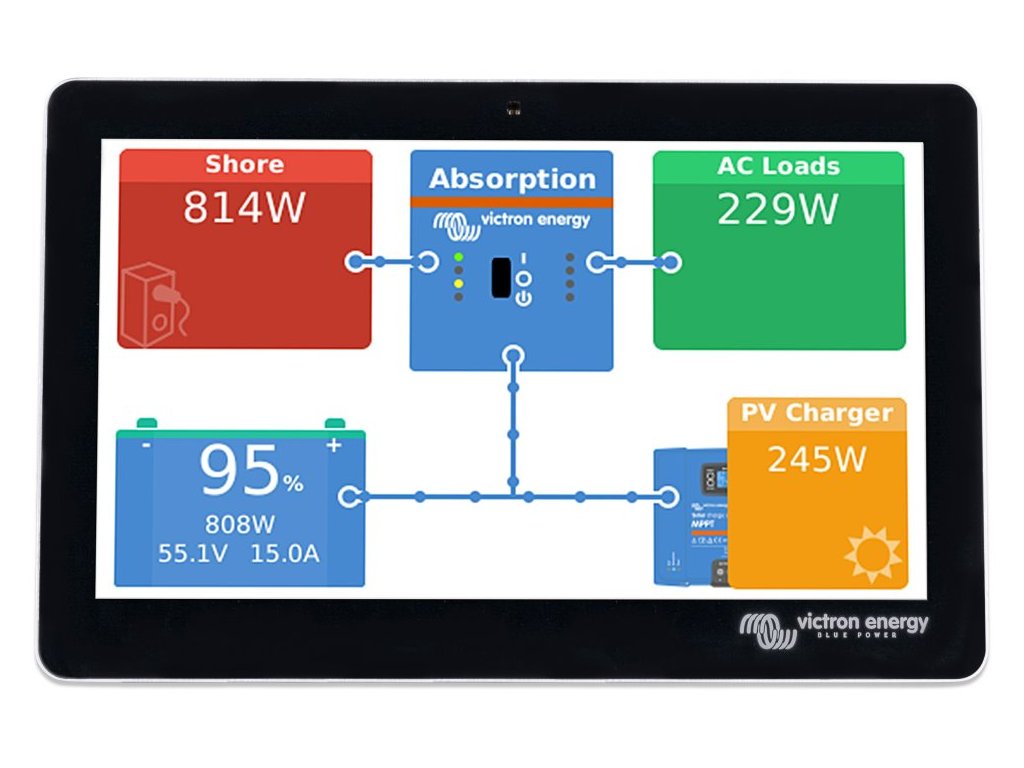 Dotykový displej GX Touch je optimalizován tak, aby splňoval standardy odborníků provádějících instalaci. Displej lze přišroubovat přímo na palubní desku, takže není zapotřebí vyřezávat vhodný otvor (jak tomu bylo u zařízení Color Control GX). Připojuje se pouze jedním kabelem, což znamená, že už nemusíte táhnout k palubní desce více kabelů.