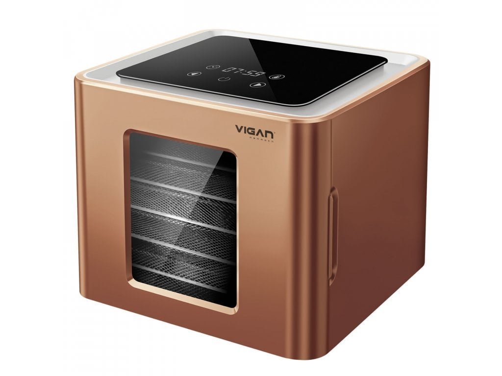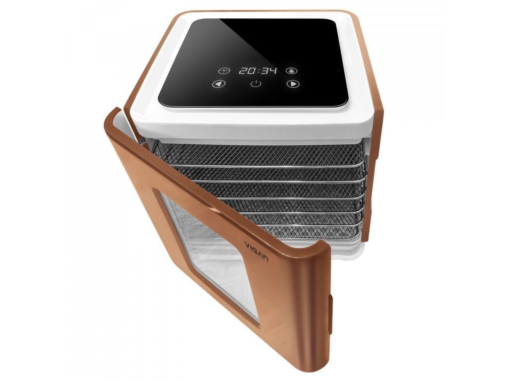 Výkonná teplovzdušná sušička potravin Vigan Mammoth ESP4DG v novém elegantním designovém provedení - skříňka s čelními uzavíratelnými dvířky. LED displej s pohodlným dotykovým ovládáním na víku sušičky. Příkon 400 W garantuje rychlé a efektivní sušení ovoce, zeleniny, hub, různých druhů masa, bylinek a jiných plodin. Vhodná i pro výrobu domácího jogurtu.