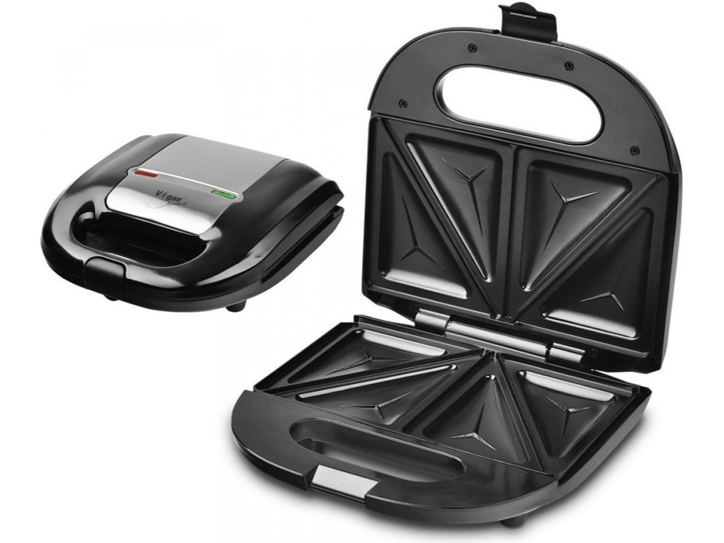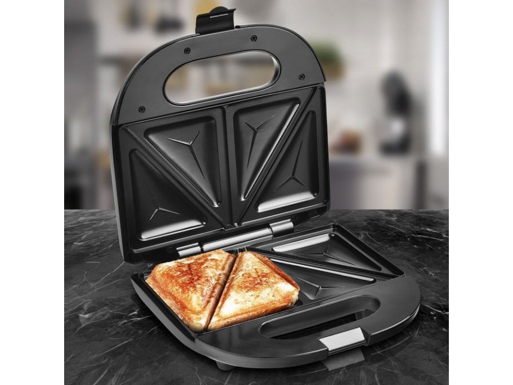 sendvičovač • 4 trojúhelníkové sendviče • snadno čistitelné pečicí plochy • kompaktní konstrukce • vertikální ukládání • příkon 750 W • indikátor připravenosti k pečení