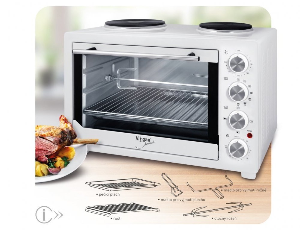 Elektrická pečicí trouba s grilem a 2 horními plotýnkami, 2 litinové plotny - levá plotýnka 185 mm - příkon 1200 W, pravá plotýnka 155 mm, příkon - 600 W. Je možné používat plotýnky a troubu současně. Trouba navíc disponuje funkcí horkovzdušného pečení.