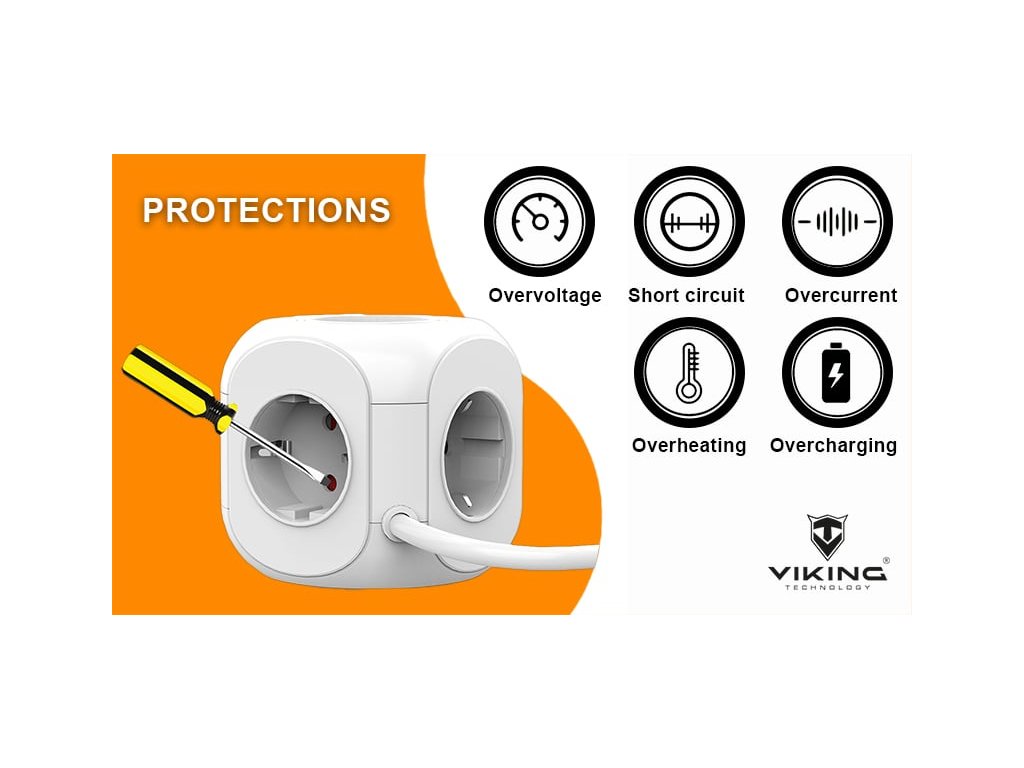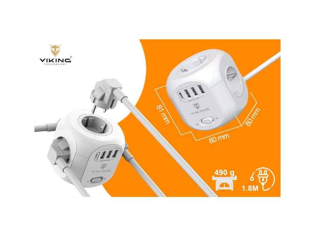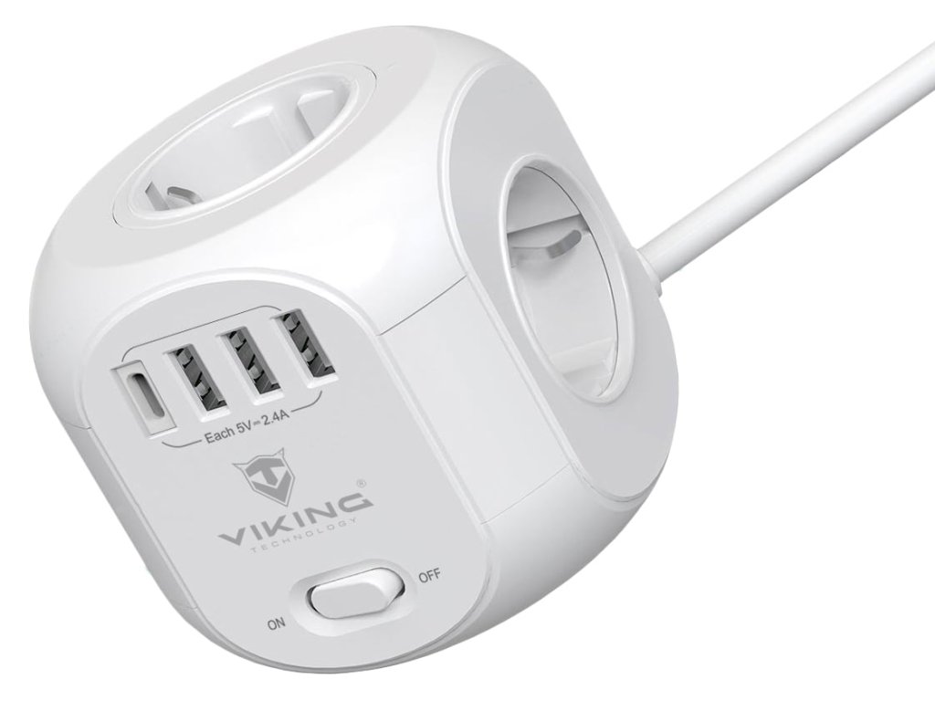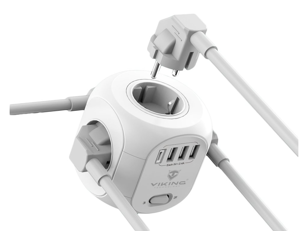 Síťový adaptér Viking AC Cube je praktickou kombinací čtyř zásuvek, čtyř USB portů a 1,8 m prodlužovacího kabelu v jednom, který šetří místo a umožňuje napájení až 8 zařízení současně.