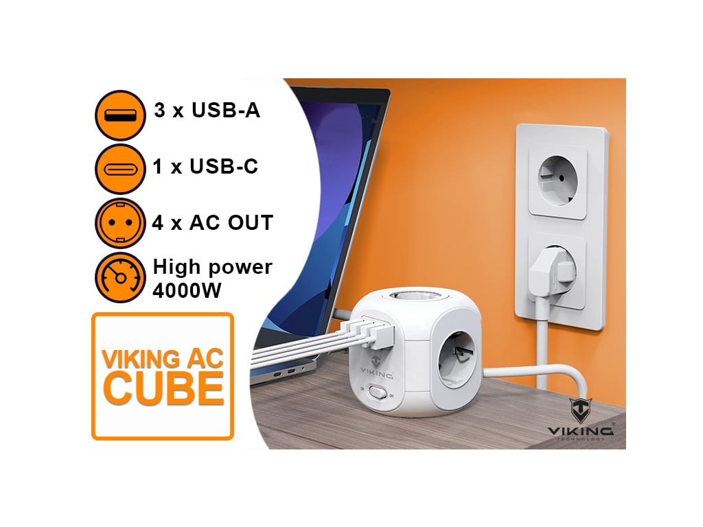 Díky čtyřem AC zásuvkám, třem USB-A portům a jednomu USB-C portu umožňuje Viking AC Cube současné napájení až osmi zařízení. Už nikdy nebudete muset hledat volnou zásuvku nebo USB port.