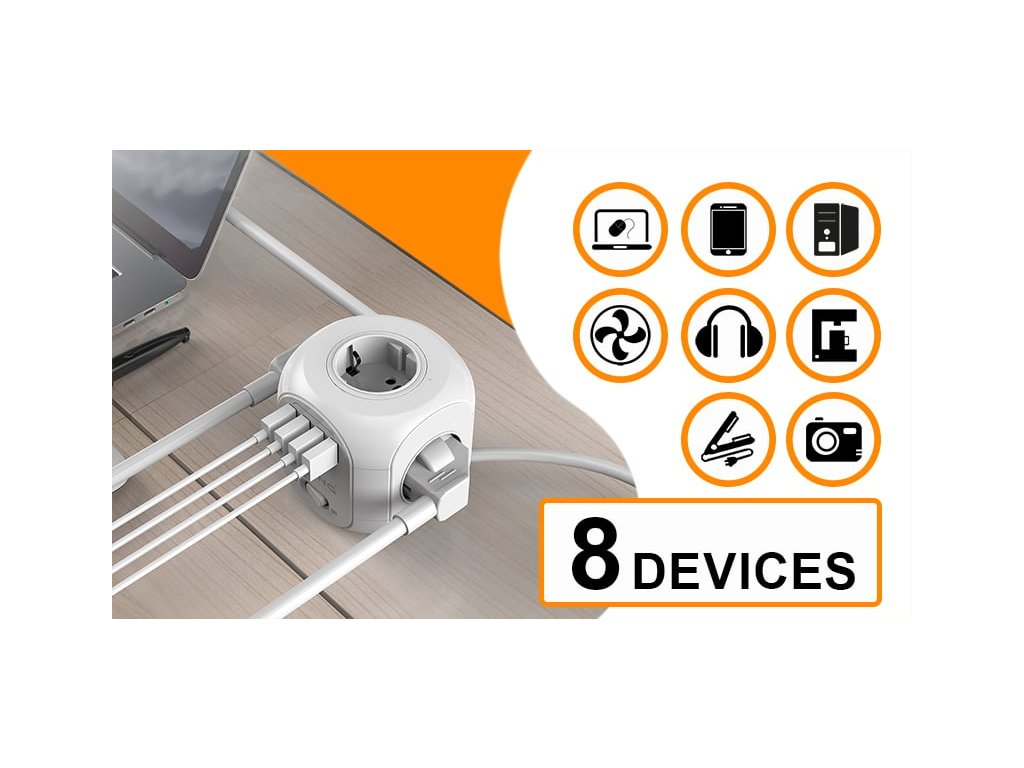 Síťový adaptér • zásuvka • rozbočovač • 4 x AC výstup (230V) • 3 x USB-A výstup 12W (5V/2.4A) • 1 x USB-C výstup 15W (5V/3A) • krychlový design • tlačítko ON/OFF • kompaktní rozměry • délka kabelu 1,8 m • možnost nabíjení až 8 zařízení současně