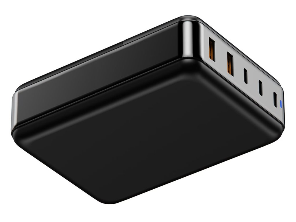 Síťový adaptér, 2 x USB-A QC, 3 x USB-C PD, podpora rychlonabíjení Qualcomm Quick Charge 3.0 a Power Delivery 3.0, chytré sdílení výkonu, maximální výkon 200W, technologie GaN, možnost nabíjení až 5 zařízení současně, praktický stojan v balení