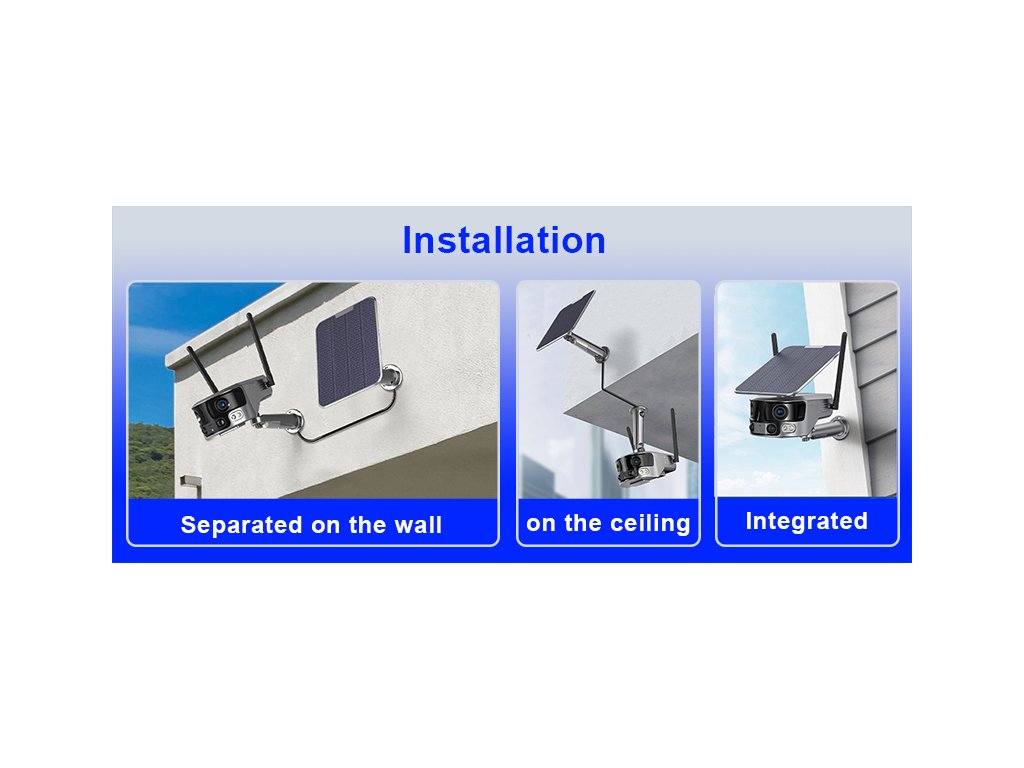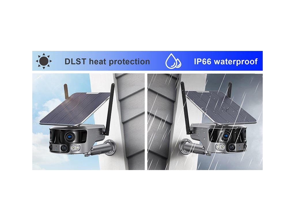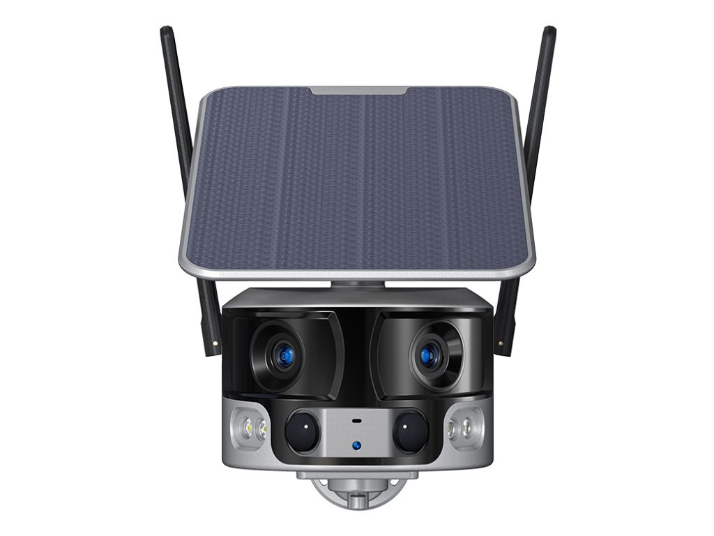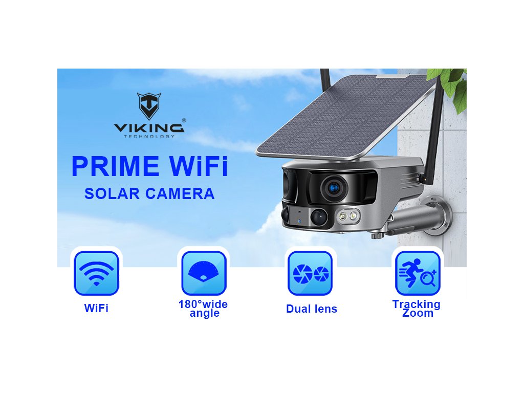 Solární 4K kamera Viking PRIME WiFi, která disponuje panoramatickými čočkami s 180° úhlem pohledu, IP66 ochranou (platí pouze v případě, že jsou všechny vstupní i výstupní konektory zakryté např. silikonovým ochranným krytem), PIR čidlem, detekcí lidského pohybu a nočním viděním. Ke kameře je také možno připojit výkonný solární panel, díky kterému je kamera nezávislá na elektrické síti.