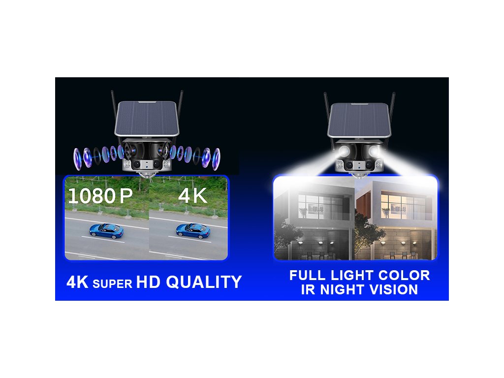 Solární 4K kamera VIKING PRIME WiFi s duálními čočkami a 180° ultra širokým složeným obrazem. Kamera disponuje ochranou IP66, nočním infračerveným viděním a solárním panelem pro instalaci v místech bez elektrické sítě.