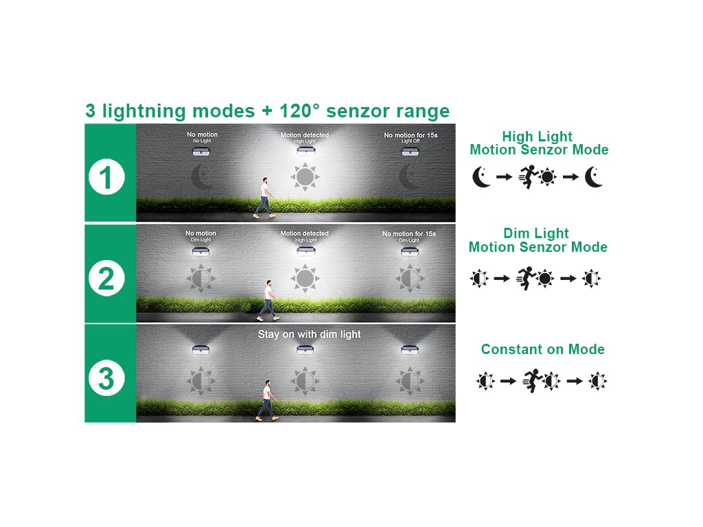 Baterie v solárním světle poskytuje dostatečný výkon pro celonoční osvětlení. Doba svitu záleží na intenzitě světla. Podle vybraného světelného režimu vám LED světlo vydrží svítit 8-12 hodin. Vestavěný pohybový senzor detekuje pohyb v rozmezí od 3 do 5 m v pozorovacím úhlu 120° a zároveň dokáže rozpoznat falešný pohyb (pohyb větví, vítr, atd.)