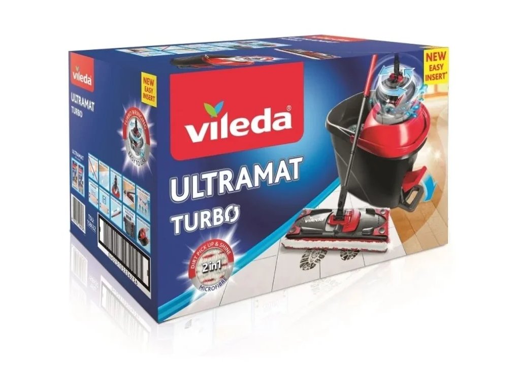 Vileda Ultramax TURBO Microfibre 2v1 - jednoduché a velmi efektivní vyždímání mopu díky vylepšenému a zjednodušenému vkládání mopu do ždímacího koše a vyždímání díky rotačnímu systému poháněného pouhým sešlápnutím pedálu.