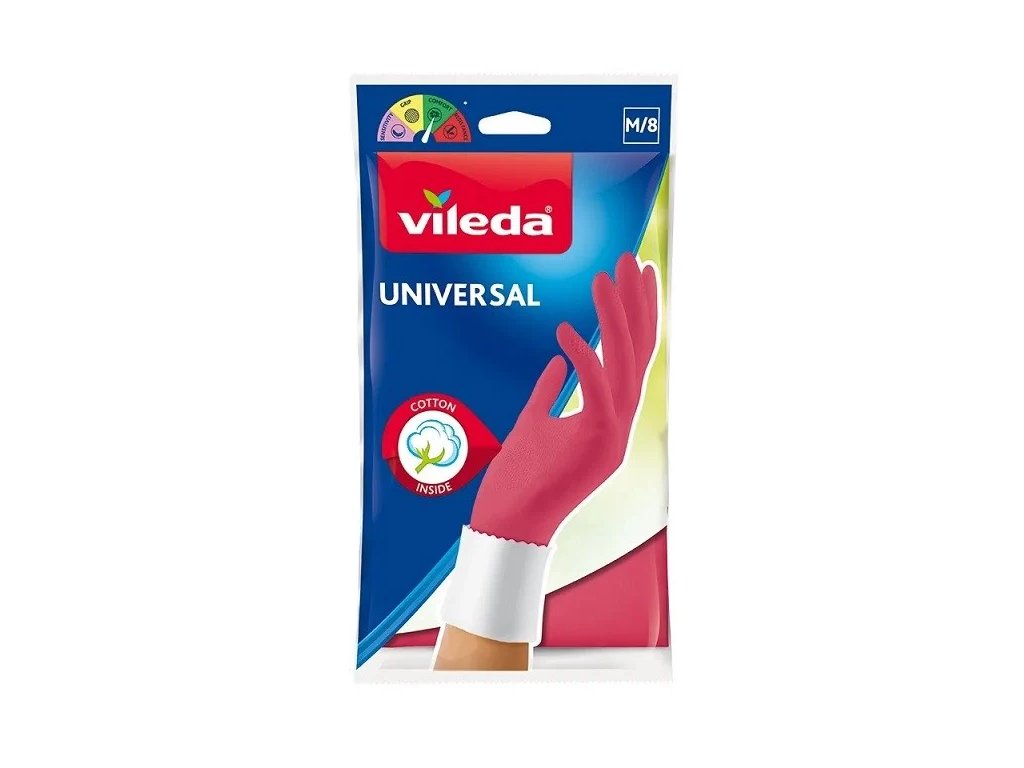 Saponáty a čisticí prostředky, které používáte při údržbě svého domova, často škodí vašim rukám. Potřebnou ochranu jim dodáte s použitím rukavic. Rukavice VILEDA Universal M jsou určeny pro domácnost, využijete je v kuchyni ale třeba i při úklidu. Tyto jemné rukavice vás potěší na dotek příjemným bavlněným vnitřkem. Povrchový vzor zlepšuje úchop ve vlhkých i v suchých podmínkách. Rukavice VILEDA Universal M jsou vyrobené z přírodního latexu, díky tomu jsou pružné a lépe se přizpůsobí vaší dlani.