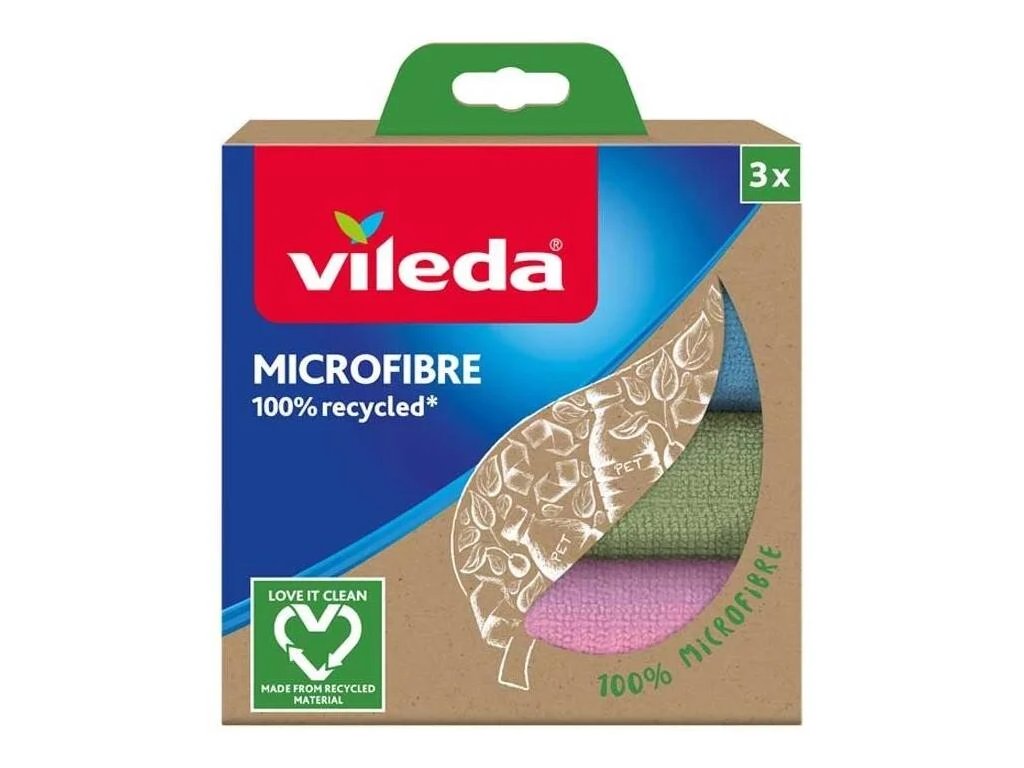 Sada hadříků Vileda Recycled vám pomůže s každodenním úklidem domácnosti. Součástí balení jsou 3 kusy vyrobené ze 100% recyklovaného materiálu z PET lahví. Nejjemnější vlákna se přitom postarají o efektivní odstranění odolných a mastných nečistot. Hadřík na povrchu nezanechává žádné kapky ani šmouhy.