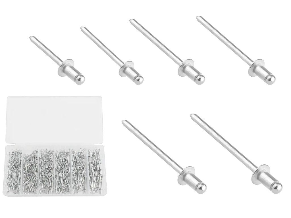 Sada obsahuje 320 ks trhacích nýtů vyrobených z hliníku a uhlíkové oceli s anodickou oxidací a galvanizovanou povrchovou úpravou pro zvýšenou odolnost proti korozi