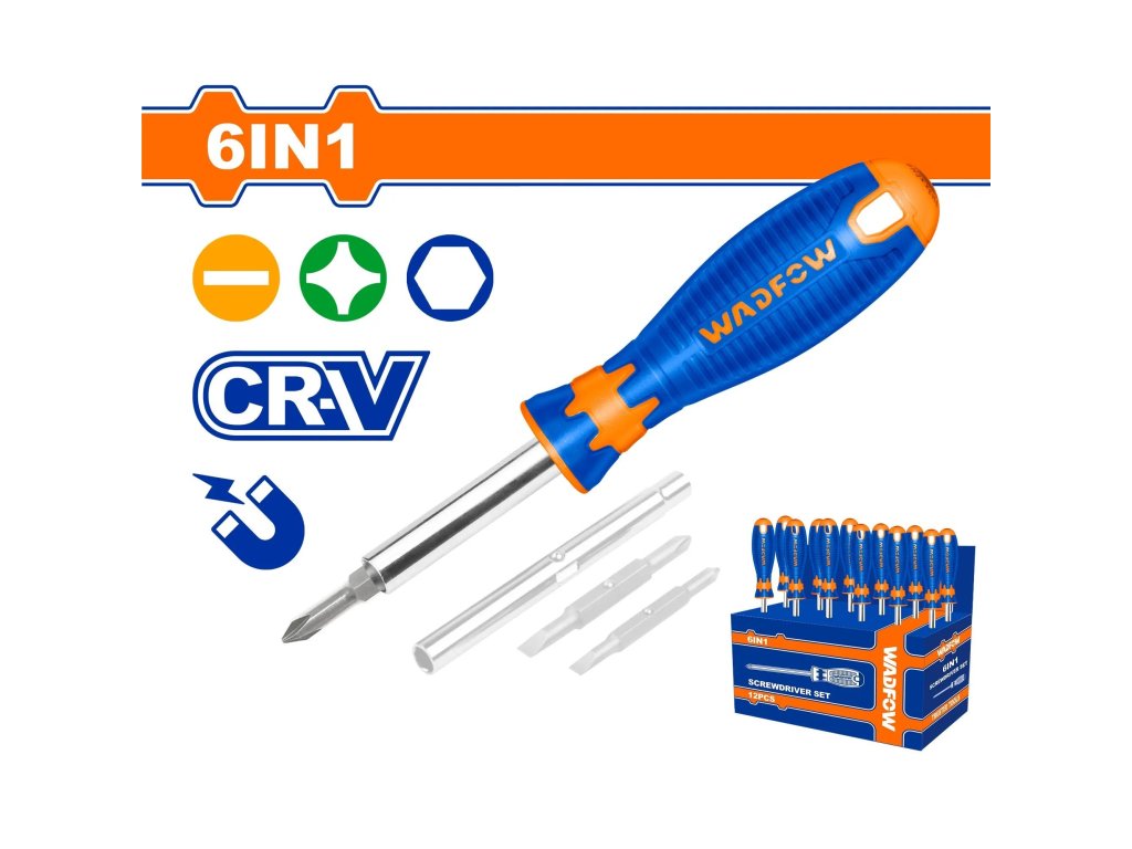 6 funkcí v 1 šroubováku: 2 ks dvoucestných bitů: 6,35 * 65 mm, PH1 + SL5 8,00 * 75 mm, PH2 + SL6 2ks zásuvkou: 6 mm, 8 mm 1 ks