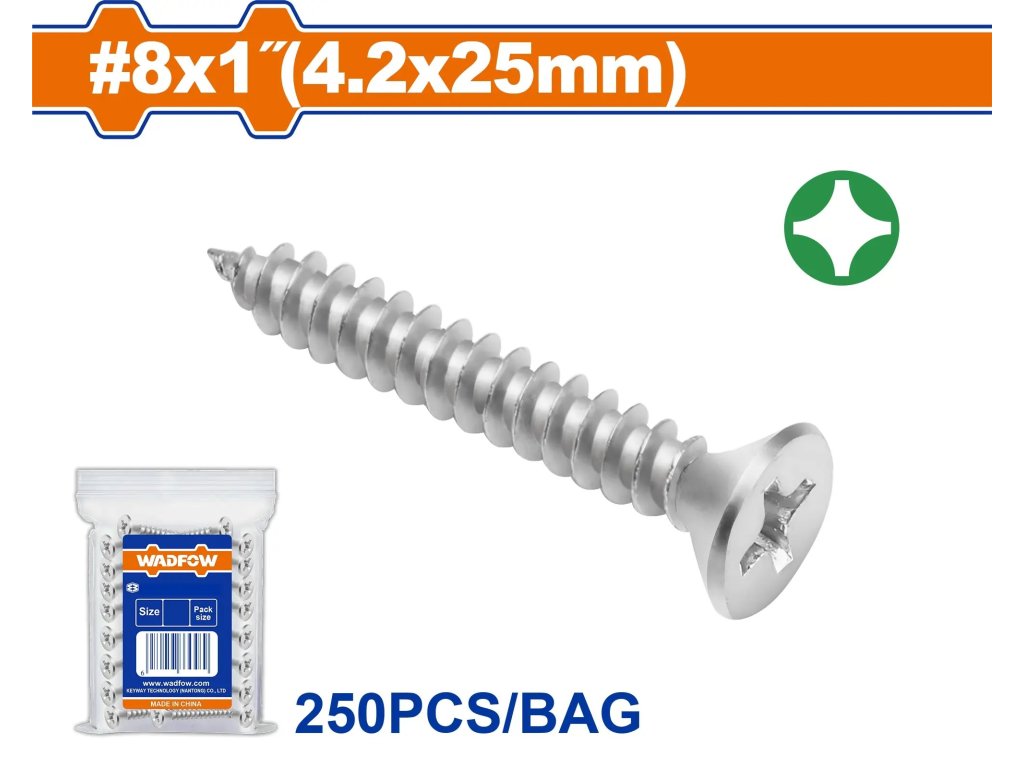 Balení obsahuje 250 ks samořezných šroubů se zápustnou hlavou o rozměru #8×1" (4,2×25 mm).