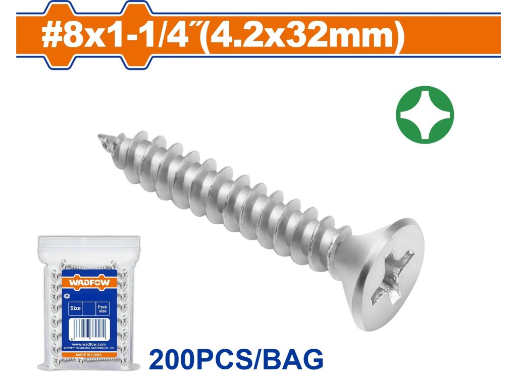 Balení obsahuje 200 ks samořezných šroubů se zápustnou hlavou o rozměru #8×1-1/4" (4,2×32 mm)