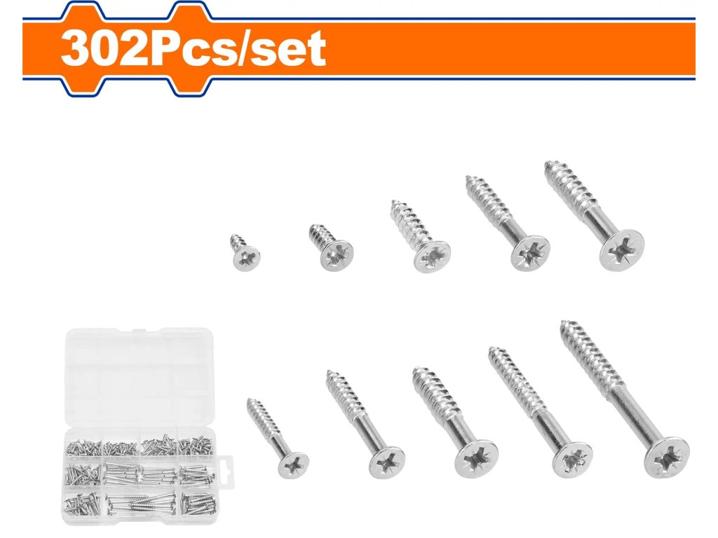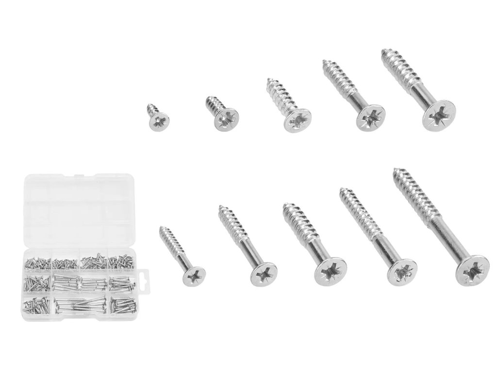 Sada obsahuje 302 ks samořezných šroubů se zápustnou hlavou vyrobených z uhlíkové oceli s pozinkovanou povrchovou úpravou, která zajišťuje zvýšenou odolnost proti korozi. Šrouby jsou vhodné pro široké spektrum použití v dílně i domácnosti. Sada obsahuje různé velikosti, což umožňuje flexibilní využití při montážích a opravách.