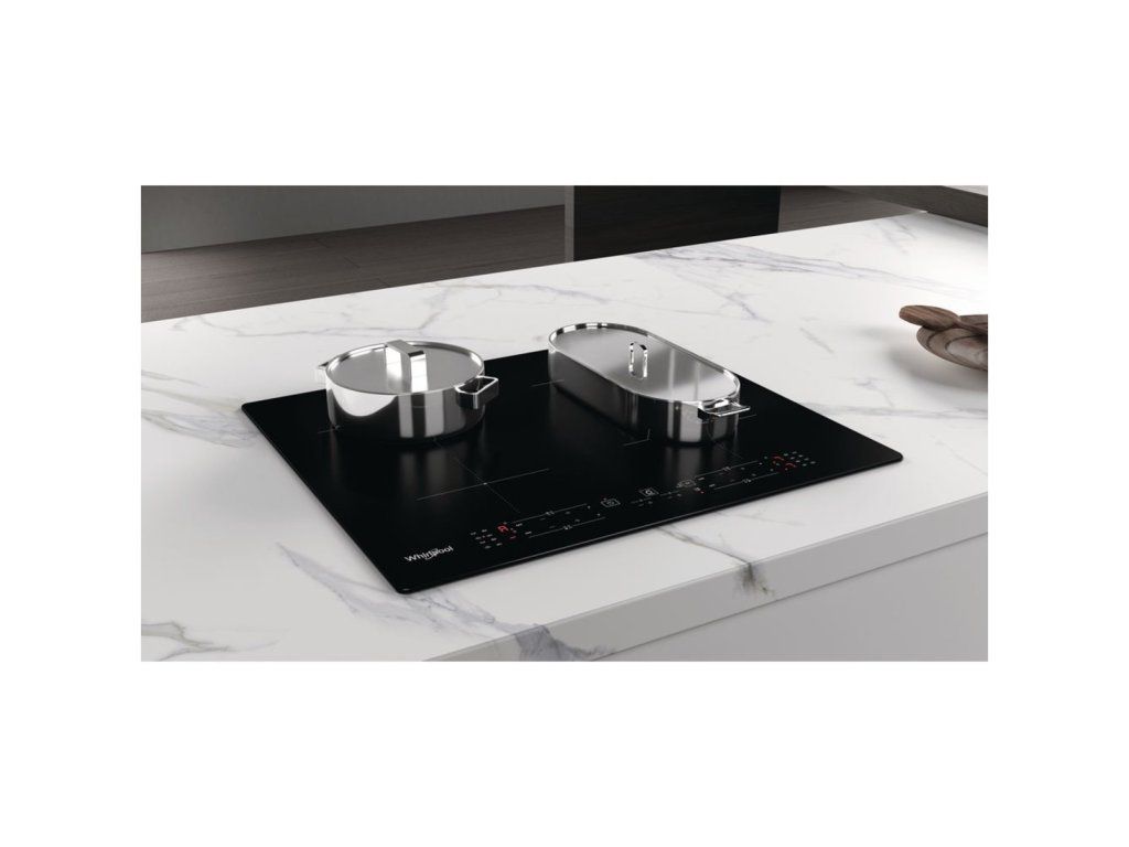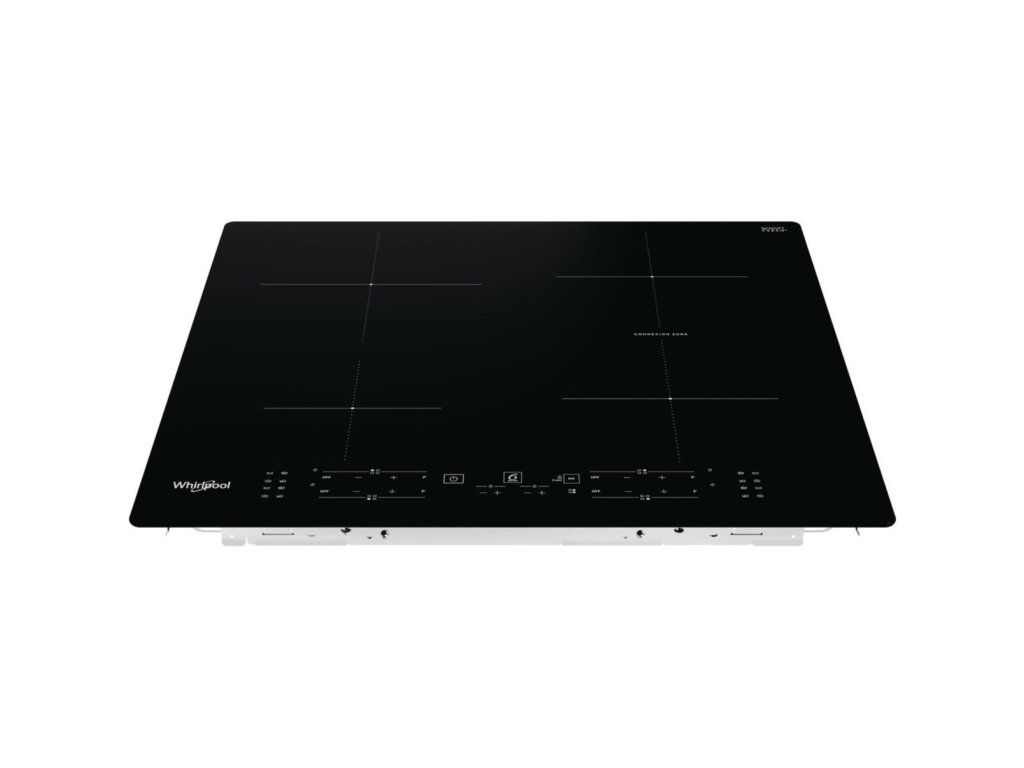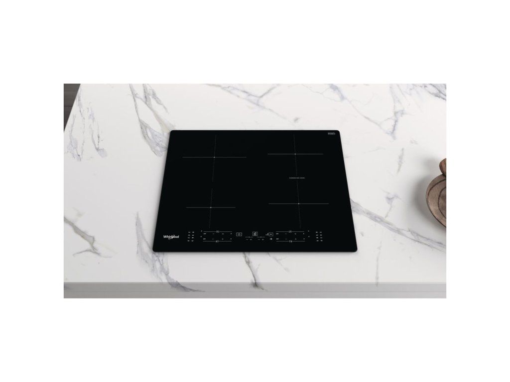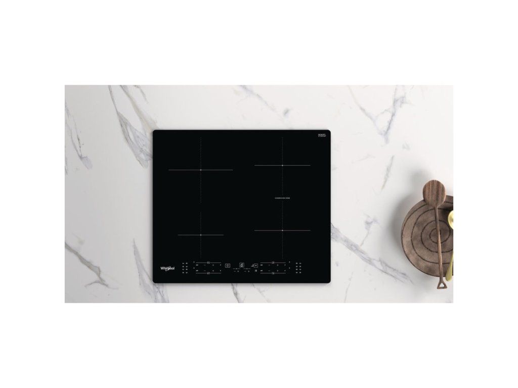 Indukční varná deska Whirlpool WB B8360 NE, černé provedení, šířka 59 cm, 4 varné zóny, Connexion Zone pro spojení 2 varných zón, funkce PowerManagement, funkce Booster, dotykové ovládání v přední části, technologie 6. smysl, dětská pojistka, časovač, příkon 7 200 W, rozměry (v × š × h): 5,4 × 59 × 51 cm.