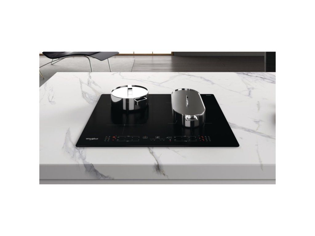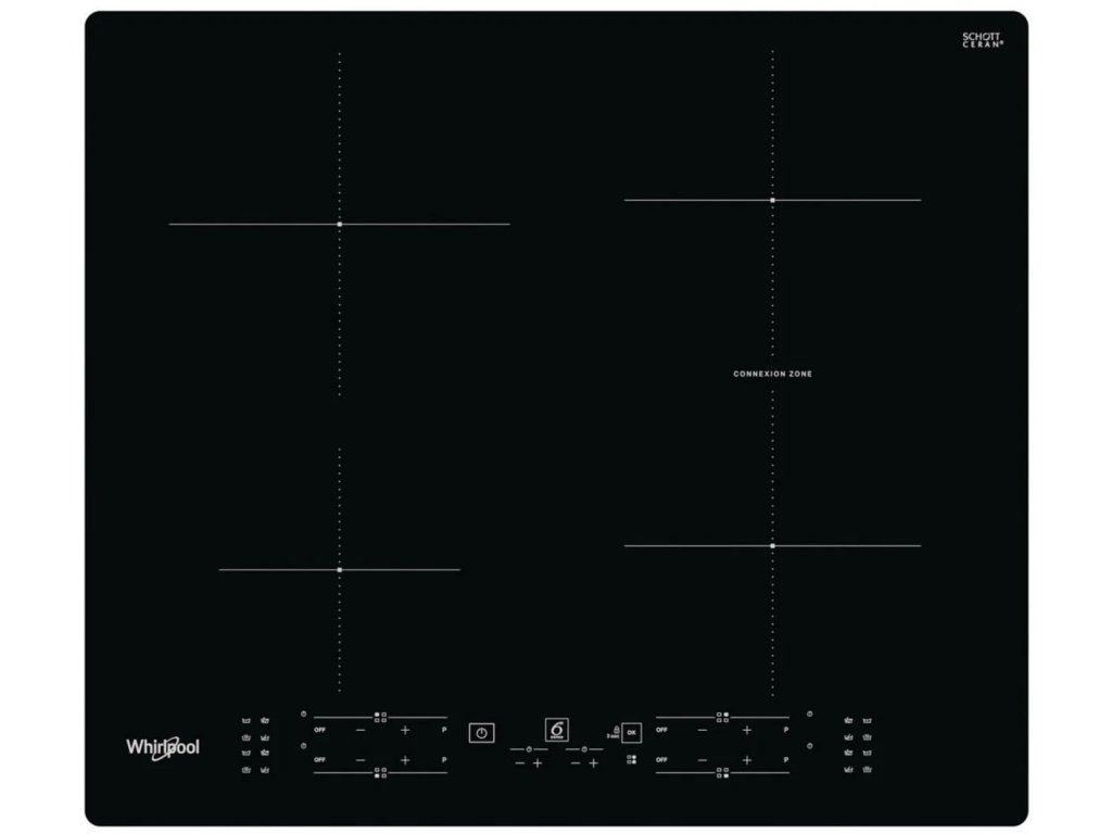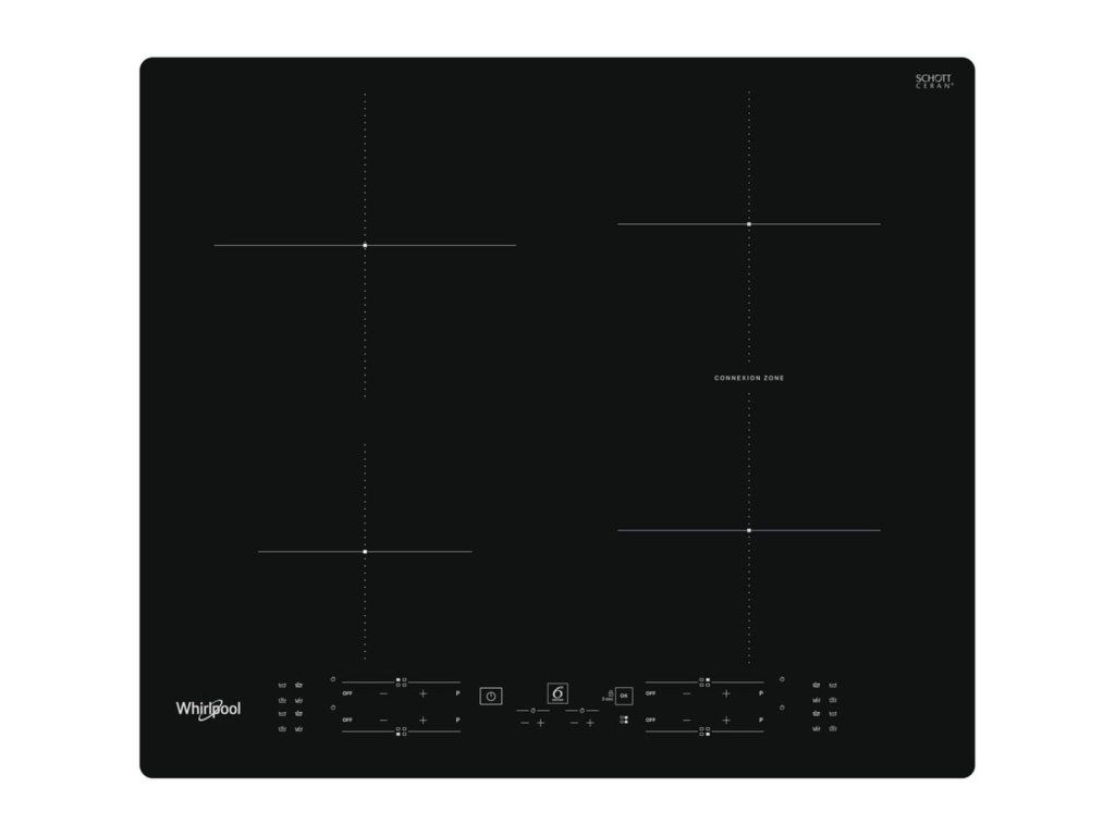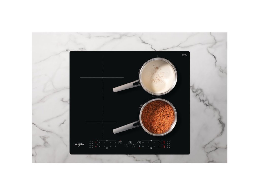 Indukční varná deska Whirlpool WB B8360 NE, černé provedení, šířka 59 cm, 4 varné zóny, Connexion Zone pro spojení 2 varných zón, funkce PowerManagement, funkce Booster, dotykové ovládání v přední části, technologie 6. smysl, dětská pojistka, časovač, příkon 7 200 W, rozměry (v × š × h): 5,4 × 59 × 51 cm.