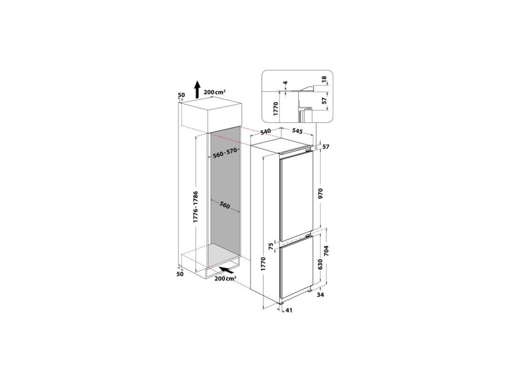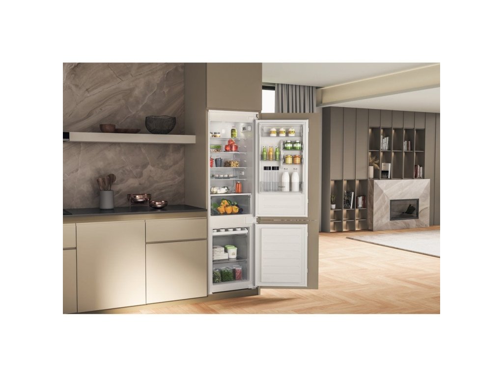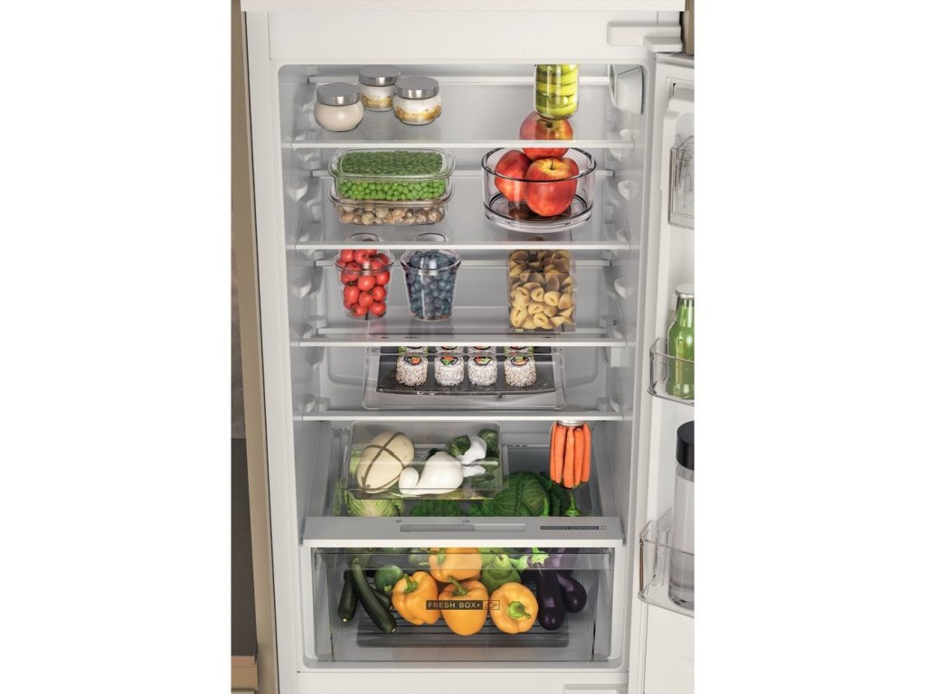 Vestavná kombinovaná lednička s mrazákem dole, objem 189/79 litrů, barva bílá, energetická třída E, hlučnost 34 dB, technologie Fast Freeze, Less Frost, 6. SMYSL, atd., LED osvětlení výška 177 cm, šířka 54 cm.